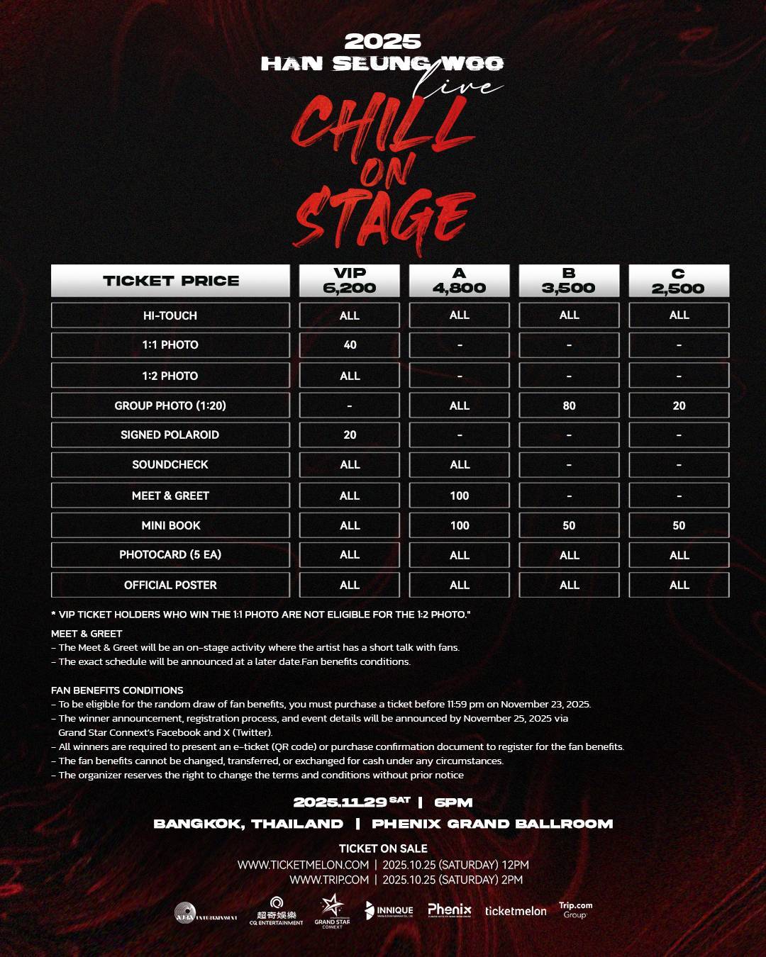 เตรียมตัว เตรียมใจ เตรียมวอร์มนิ้วให้พร้อม แล้วมาเจอกับ “ฮันซึงอู” กับงาน 2025 HAN SEUNG WOO LIVE : CHILL ON STAGE in BANGKOK ในวันเสาร์ที่ 29 พฤศจิกายน 2568 ณ Phenix Grand Ballroom เปิดจำหน่ายบัตรในวันเสาร์ที่ 25 ตุลาคม 2568 ทาง http://Ticketmelon.com เวลา 12:00 น. และทาง http://Trip.com เวลา 14:00 น. บัตรราคา 6,200 / 4,800 / 3,500 และ 2,500 บาท
