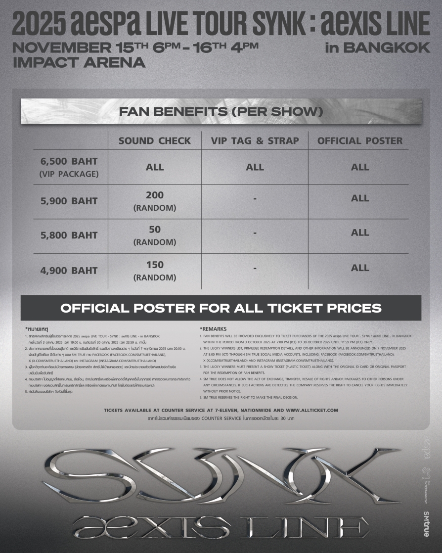 เมื่อความร่วมมือระหว่าง aespa (เอสป้า) และ MY (มาย) เริ่มต้นขึ้น แกนกลางที่อยู่เหนือทุกจินตนาการจะถูกค้นพบอย่างน่าตื่นตาตื่นใจที่สุดในวันที่มีความหมายอันน่าจดจำนี้ ณ คอนเสิร์ต ‘2025 aespa LIVE TOUR – SYNK : aeXIS LINE – in BANGKOK’ เปิดจำหน่ายบัตรรอบสมาชิก “MY” Membership (GL) Pre-Sale ในวันศุกร์ที่ 3 ตุลาคม 2025 เวลา 19:00 น. – 23:59 น., รอบสมาชิก JOY CLUB Pre-Sale วันเสาร์ที่ 4 ตุลาคม 2025 เวลา 11:00 น. – 15:59 น. และรอบบุคคลทั่วไป วันอาทิตย์ที่ 5 ตุลาคม 2025 ตั้งแต่เวลา 11:00 น. เป็นต้นไป ทางเคาน์เตอร์เซอร์วิสในร้าน 7-Eleven ทุกสาขาทั่วประเทศ และทางเว็บไซต์ www.allticket.com/event/aespa_SYNK_aeXISLINE_in_BANGKOK บัตรราคา 6,500 (VIP PACKAGE) / 5,900 (บัตรยืน) / 5,800 / 4,900 (บัตรยืน) / 3,900 / 2,900 / 2,200 บาท พร้อมสิทธิพิเศษสำหรับผู้ซื้อบัตร ติดตามข่าวสารและรายละเอียดเพิ่มเติมของคอนเสิร์ตได้ทางบัญชีโซเชียลมีเดียต่าง ๆ ของ SM True : เฟซบุ๊ก facebook.com/smtruethailand, อินสตาแกรม instagram.com/smtruethailand, เอ็กซ์ x.com/SMTrueThailand และ TikTok (ติ๊กต๊อก) tiktok.com/@smtruethailand สอบถามข้อมูลเพิ่มเติมเกี่ยวกับการซื้อบัตรได้ทาง Counter Service : อีเมล support@allticket.com และไลน์ออฟฟิเชียล @counterservice