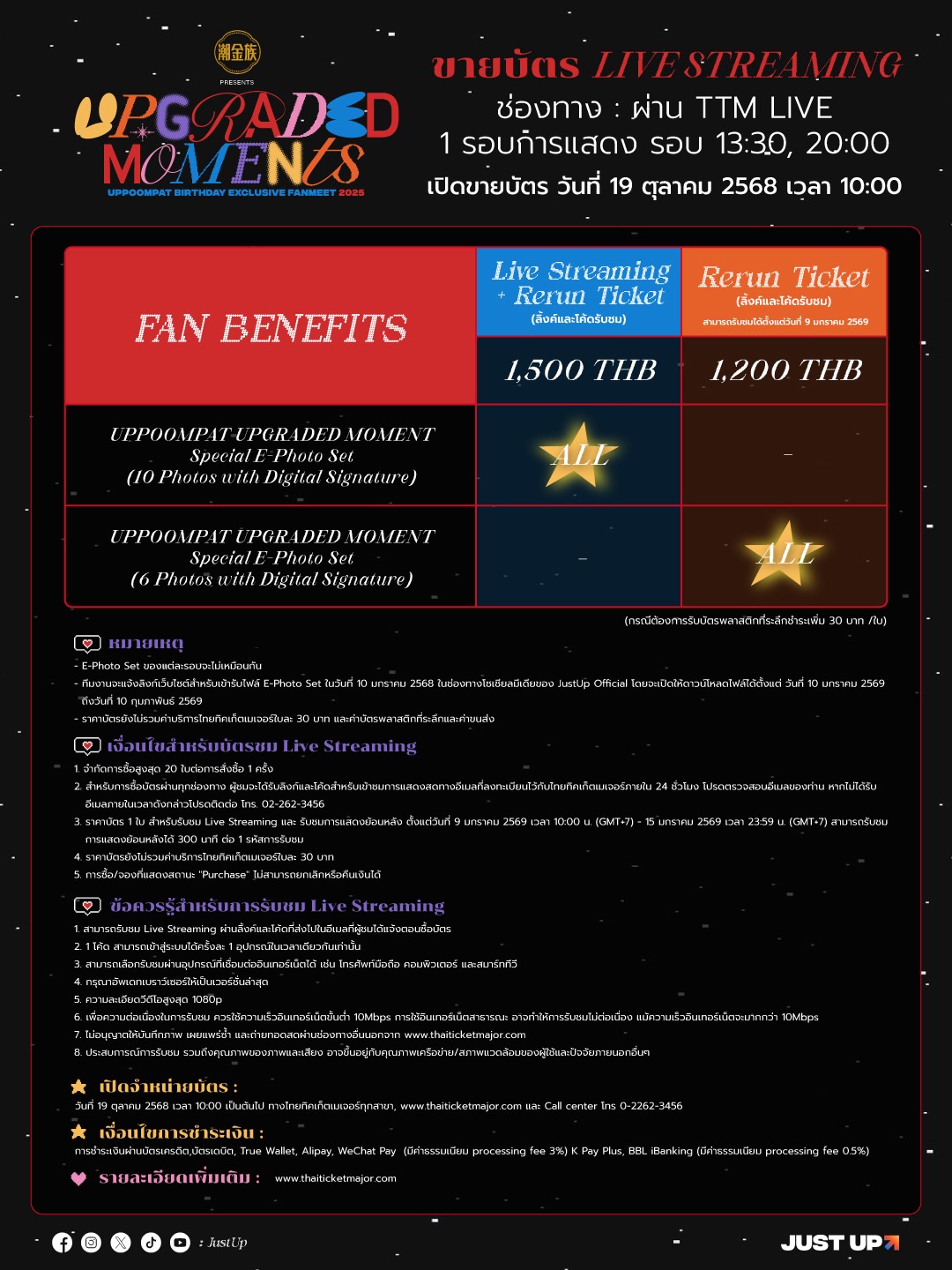 สำหรับผู้สนใจเตรียมตัวให้พร้อม! เปิดจำหน่ายบัตร Live Streaming งาน “Tide Gold Tribe Presents UPGRADED MOMENTS UPPOOMPAT BIRTHDAY EXCLUSIVE FANMEET 2025” ในวันอาทิตย์ที่ 19 ตุลาคม 2568 เวลา 10.00 น. บัตรราคา 1,500 บาท(ลิ้งค์และโค้ดรับชม) ผ่านทาง www.thaiticketmajor.com และติดตามรายละเอียดเพิ่มเติมได้ที่ JustUp official : Facebook / Instagram / X