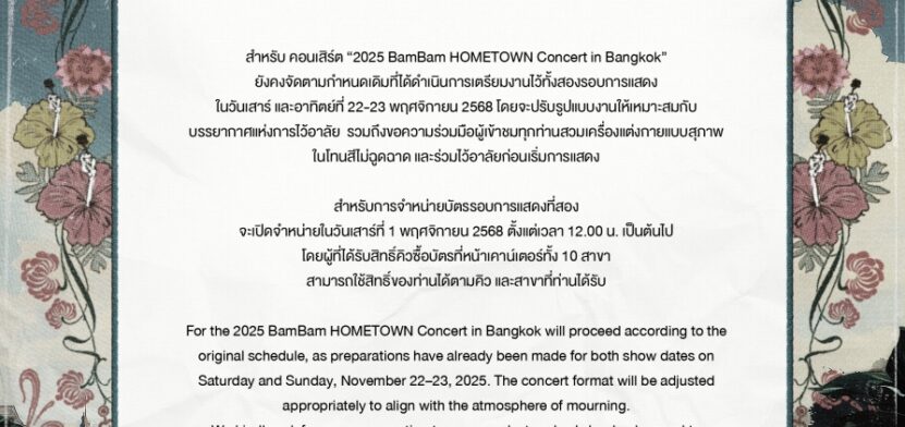ผู้จัด ไอมี่ไทยแลนด์ ประกาศยังคงจัดงานตามกำหนดเดิมที่ได้ดำเนินการเตรียมงานไว้ทั้งสองรอบการแสดงในวันเสาร์ และอาทิตย์ที่ 22-23 พฤศจิกายน 2568 โดยจะปรับรูปแบบงานให้เหมาะสมกับบรรยากาศแห่งการไว้อาลัย รวมถึงขอความร่วมมือผู้เข้าชมทุกท่านสวมเครื่องแต่งกายแบบสุภาพในโทนสีไม่ฉูดฉาด และร่วมไว้อาลัยก่อนเริ่มการแสดง