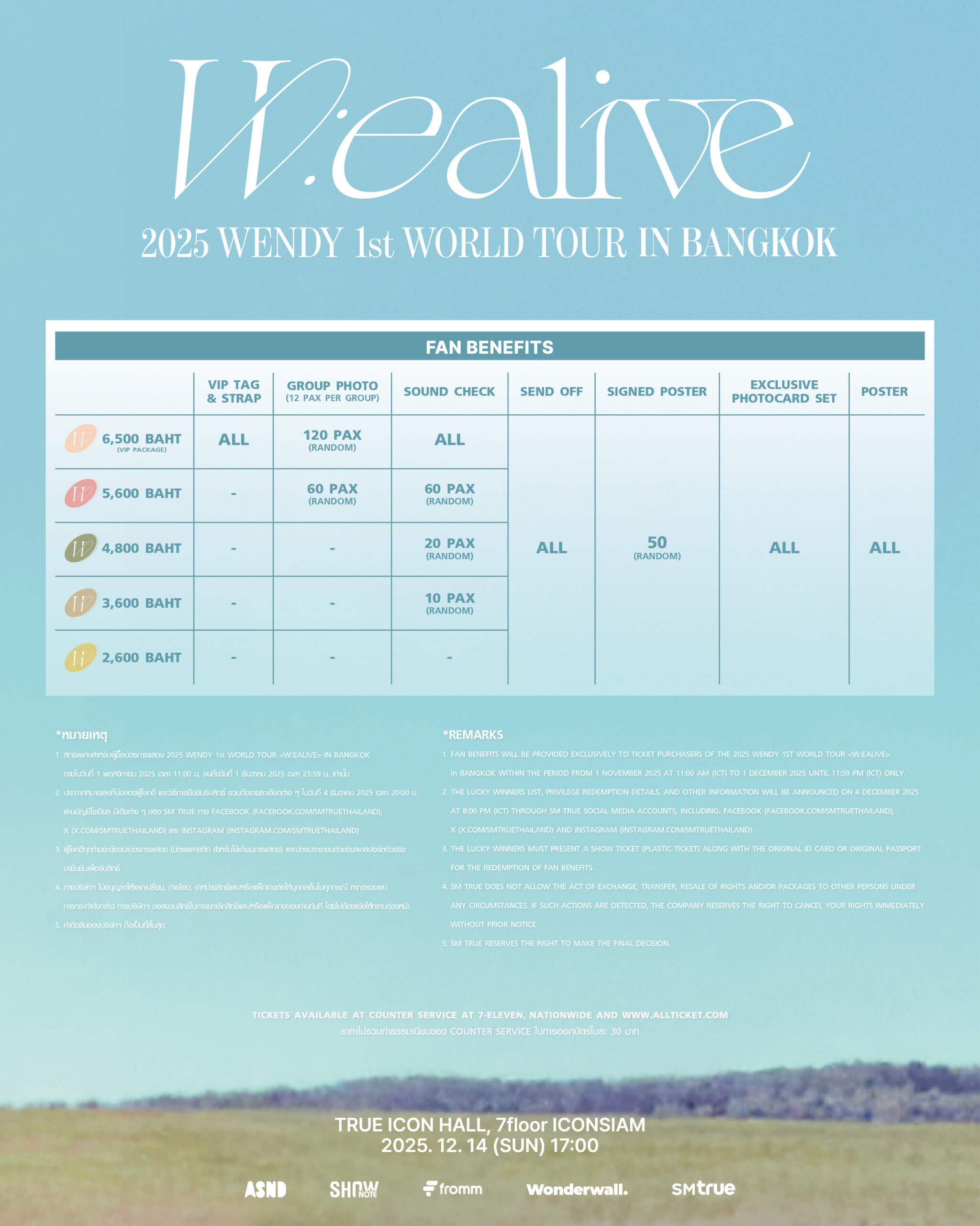 เตรียมท่องไปในเรื่องราวแห่งบทเพลงที่มีเพียงแค่ WENDY (เวนดี้) และ ReVeluv (เรเวเลิฟ) แล้วปล่อยให้ท่วงทำนองกับเสียงร้องของเธอคนนี้ได้โอบกอดทุกคนสักครั้งในชีวิต ด้วยคอนเสิร์ต ‘2025 WENDY 1st WORLD TOUR <W:EALIVE> IN BANGKOK’ เปิดจำหน่ายบัตรรอบสมาชิก JOY CLUB Pre-Sale ในวันเสาร์ที่ 1 พฤศจิกายน 2025 เวลา 11:00 น. – 15:59 น. เท่านั้น และรอบบุคคลทั่วไป ในวันอาทิตย์ที่ 2 พฤศจิกายน 2025 เวลา 11:00 น. เป็นต้นไป ทางเคาน์เตอร์เซอร์วิสในร้าน 7-Eleven ทุกสาขาทั่วประเทศ และทางเว็บไซต์ www.allticket.com/event/WENDY_WEALIVEinBKK บัตรนั่งราคา 6,500 (VIP PACKAGE) / 5,600 / 4,800 / 3,600 / 2,600 บาท พร้อมสิทธิพิเศษสำหรับผู้ซื้อบัตร ติดตามข่าวสารและรายละเอียดเพิ่มเติมของคอนเสิร์ตได้ทางบัญชีโซเชียลมีเดียต่าง ๆ ของ SM True : เฟซบุ๊ก facebook.com/smtruethailand, อินสตาแกรม instagram.com/smtruethailand, เอ็กซ์ x.com/SMTrueThailand และ TikTok (ติ๊กต๊อก) tiktok.com/@smtruethailand สอบถามข้อมูลเพิ่มเติมเกี่ยวกับการซื้อบัตรได้ทาง Counter Service : อีเมล support@allticket.com และไลน์ออฟฟิเชียล @counterservice