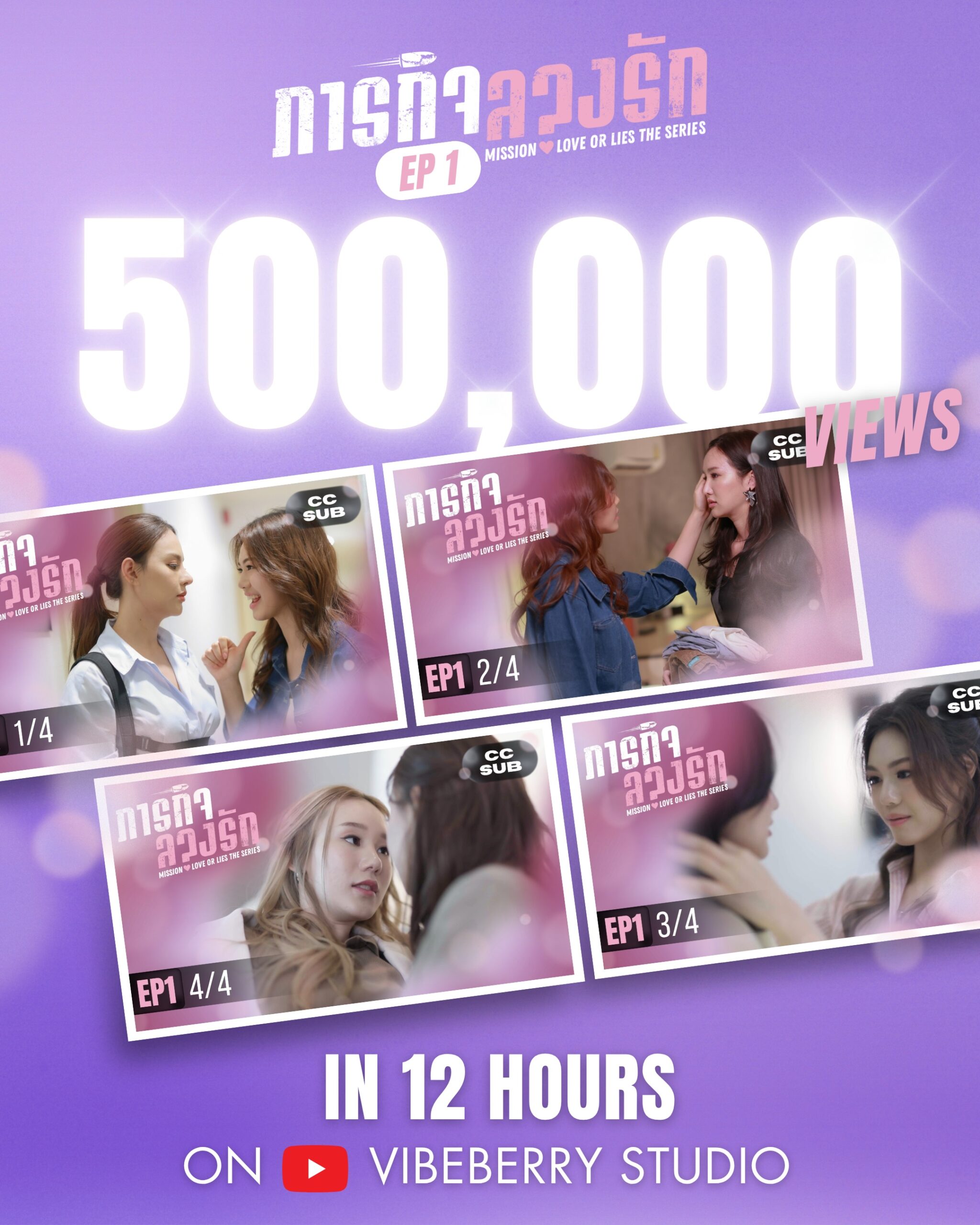 กระแสแรง ตั้งแต่อีพีแรก สำหรับซีรีส์ “Mission Love or Lies ภารกิจลวงรัก” ซีรีส์ฟอร์มดีเคมีแรงแห่งปีเรื่องแรกจากค่าย Vibeberry Studio ที่เพิ่งประเดิมภารกิจแรกบน YouTube ไปเมื่อวันพุธที่ 29 ตุลาคมที่ผ่านมา ได้สร้างปรากฏการณ์กระแสตอบรับอย่างล้นหลาม เพียงไม่ถึง 12 ชั่วโมงหลังออนแอร์ ยอดวิวรวมทะยานพุ่งสูงถึง 500,000 ครั้ง และยังคงพุ่งขึ้นอย่างต่อเนื่องจนถึงขณะนี้ นอกจากยอดวิวที่แรงไม่หยุดแล้ว คอมเมนต์จากแฟน ๆ ทั่วประเทศยังแห่กันมา “ลงเรือ” เชียร์เคมีสุดฟินของ 4 สาวนักแสดงนำอย่างล้นหลาม ต่างคาแรกเตอร์แต่ลงตัวจนต้องจับตาดู!