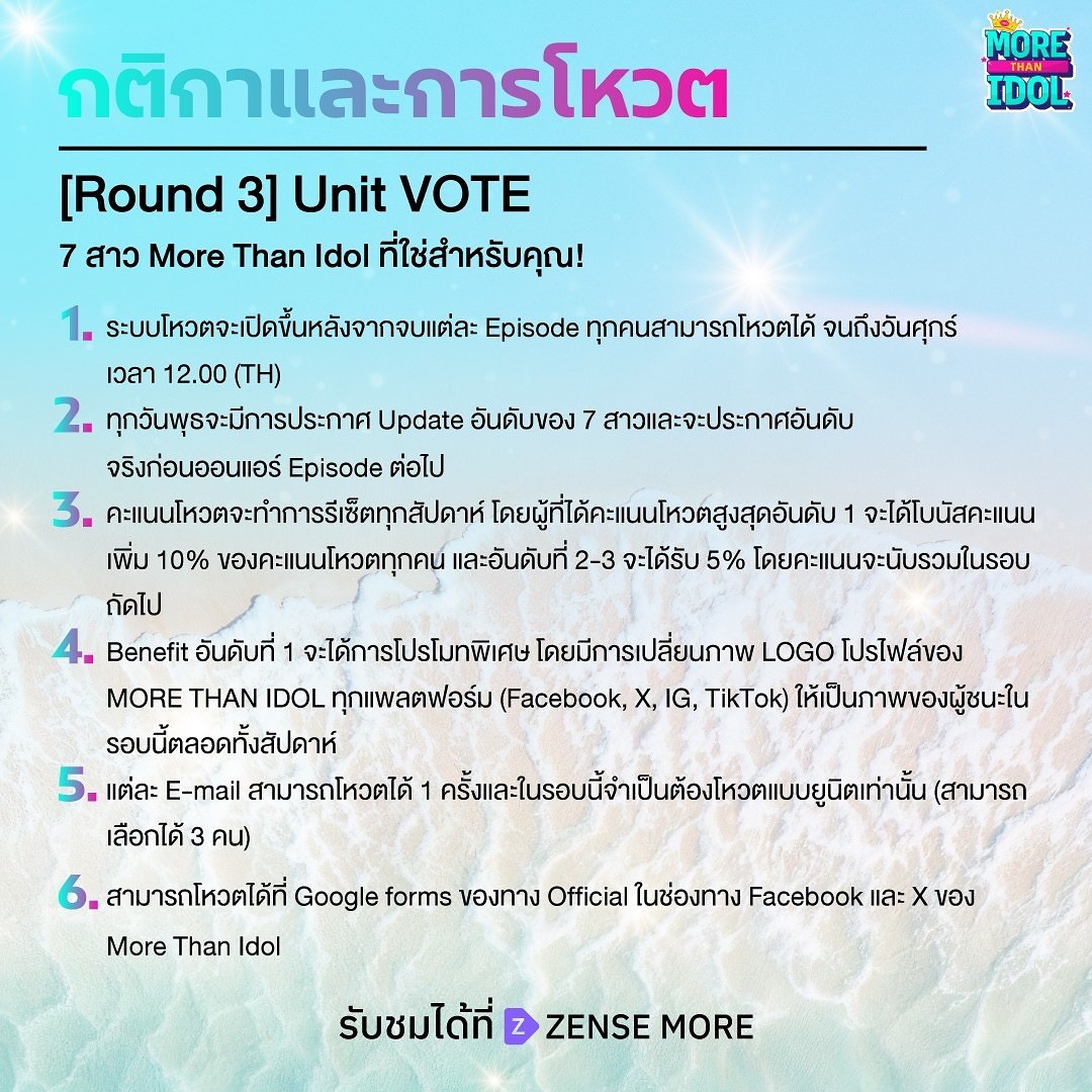 ห้ามพลาดตามลุ้น ตามจิ้นพวกเธอได้ในรายการ MORE THAN IDOL พร้อมกันทุกวันจันทร์ ทาง YOUTUBE ช่อง ZENSE MORE และร่วมโหวตให้กำลังใจทั้ง 7 สาวทุกสัปดาห์ได้ทั้ง2 วิธี ไม่ว่าจะโหวตผ่าน QR CODE ท้ายรายการ หรือ โหวตผ่าน TG MEMBER เพียงซื้อสินค้าผ่าน TG ทุก 200 บาท จะได้รับ 1 TG POINT เพื่อใช้ 20 คะแนนโหวต ซึ่งการโหวตทั้ง 2 วิธีจะนำคะแนนมารวมกันทุกสัปดาห์ สามารถติดตามข่าวสารได้ทางFACEBOOK FANPAGE : MORE THAN IDOL