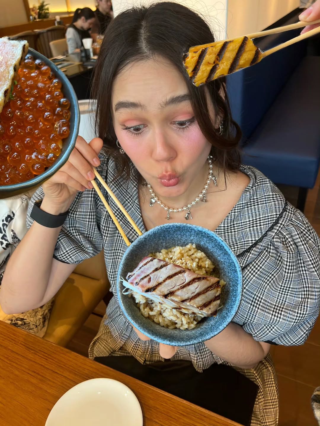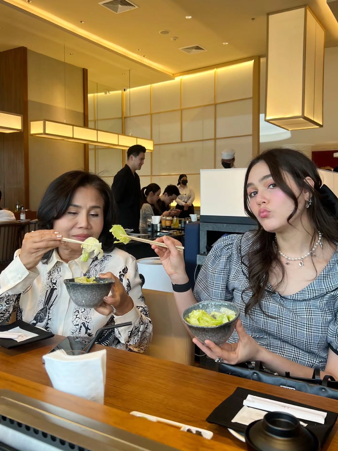 เห็นคลิปของแม่แล้วบอกเลยว่าน่าอีทสุด ๆ งานนี้ต้องขอไปสืบมาหน่อยว่ามีอะไรบ้าง? จนได้คำตอบว่าที่แม่สั่งเป็นเซ็ตใหม่ “Tenkai” สุนทรียะแห่งการย่างที่มีทั้งหมด 7 คำ โดยเพิ่มความอร่อยมาใหม่ ได้แก่ Chutoro Leek ซึ่งเป็นเมนูซิกเนอเจอร์, ชุดเสียบไม้ Shade of Toro เมนูไฮไลต์ประจำเซ็ตและมีเฉพาะสาขานี้เท่านั้น ซึ่งเป็นการรวมความอร่อยของปลาทูน่า (Maguro) ถึงสามส่วนสำคัญที่นำมาหั่นเต๋า เสียบไม้ และทาด้วยซอสสูตรพิเศษก่อนนำไปย่างอย่างพิถีพิถัน, ปลาไหลน้ำจืด (Unagi), ปลาแซลมอน, แซนวิชล็อบสเตอร์ (Lobster sando) ประกบด้วยขนมปังบริยอชโฮมเมดสูตรพิเศษจาก Kay’s Café และ ไข่หวาน ปิดท้าย บอกเลยว่างานนี้เป็นการฉลองที่แม่ชมดูฟินสุด ๆ ก่อนจะกลับไปยื่นใบสมัครทำหน้าที่คุณแม่ลูกสามเหมือนเดิม ถ้าอยากรู้ว่าที่ร้าน KAYAKI จะมีเมนูอะไรอีกบ้าง นอกจากเมนูของแม่ชม, ยายหนิง และ น้าพลอย ปักหมุดไปลองลิ้มชิมรสมาแล้ว ต้องไปลองชิมเทสระบบด้วยตัวเองที่สาขา เซ็นทรัล เอ็มบาสซี่ ชั้น 5 หรือจะตามไปส่องก่อนที่ Facebook: Kayaki และ IG: Kayaki.thailand ก็ได้นะจ้ะ