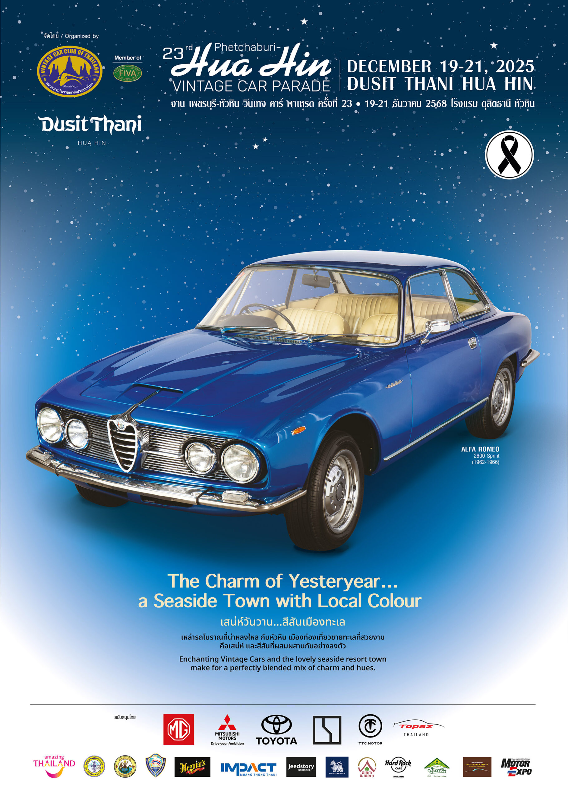สมาคมรถโบราณแห่งประเทศไทย โรงแรมดุสิตธานี หัวหิน และพันธมิตรในพื้นที่ ร่วมกันจัดงาน “เพชรบุรี–หัวหิน วินเทจ คาร์ พาเหรด ครั้งที่ 23” ตามแนวคิด “เสน่ห์วันวาน…สีสันเมืองทะเล” วันที่ 19 – 21 ธันวาคม 2568