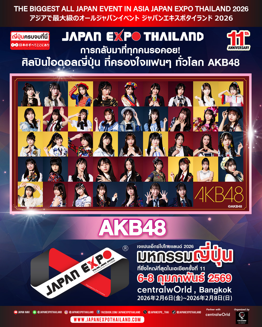 ข่าวดีที่ทำเอาแฟนคลับชาวไทยของไอดอลแห่งชาติอย่าง AKB48 ต้องกรี๊ดลั่น! หลังจากห่างหายจากเวทีไทยไปพักใหญ่ ไอดอลกรุ๊ปที่สร้างประวัติศาสตร์และคำว่า “ไอดอลแห่งชาติ” ให้โลกได้รู้จักอย่าง AKB48 กำลังจะกลับมาสร้างความประทับใจสุดยิ่งใหญ่ให้กับแฟน ๆ ชาวไทยอีกครั้ง ในงานมหกรรมญี่ปุ่นที่ใหญ่ที่สุดในเอเชียอย่าง JAPAN EXPO THAILAND 2026 ที่เตรียมจัดขึ้นระหว่างวันที่ 6-8 กุมภาพันธ์ 2569 ณ ศูนย์การค้าเซ็นทรัลเวิลด์!!