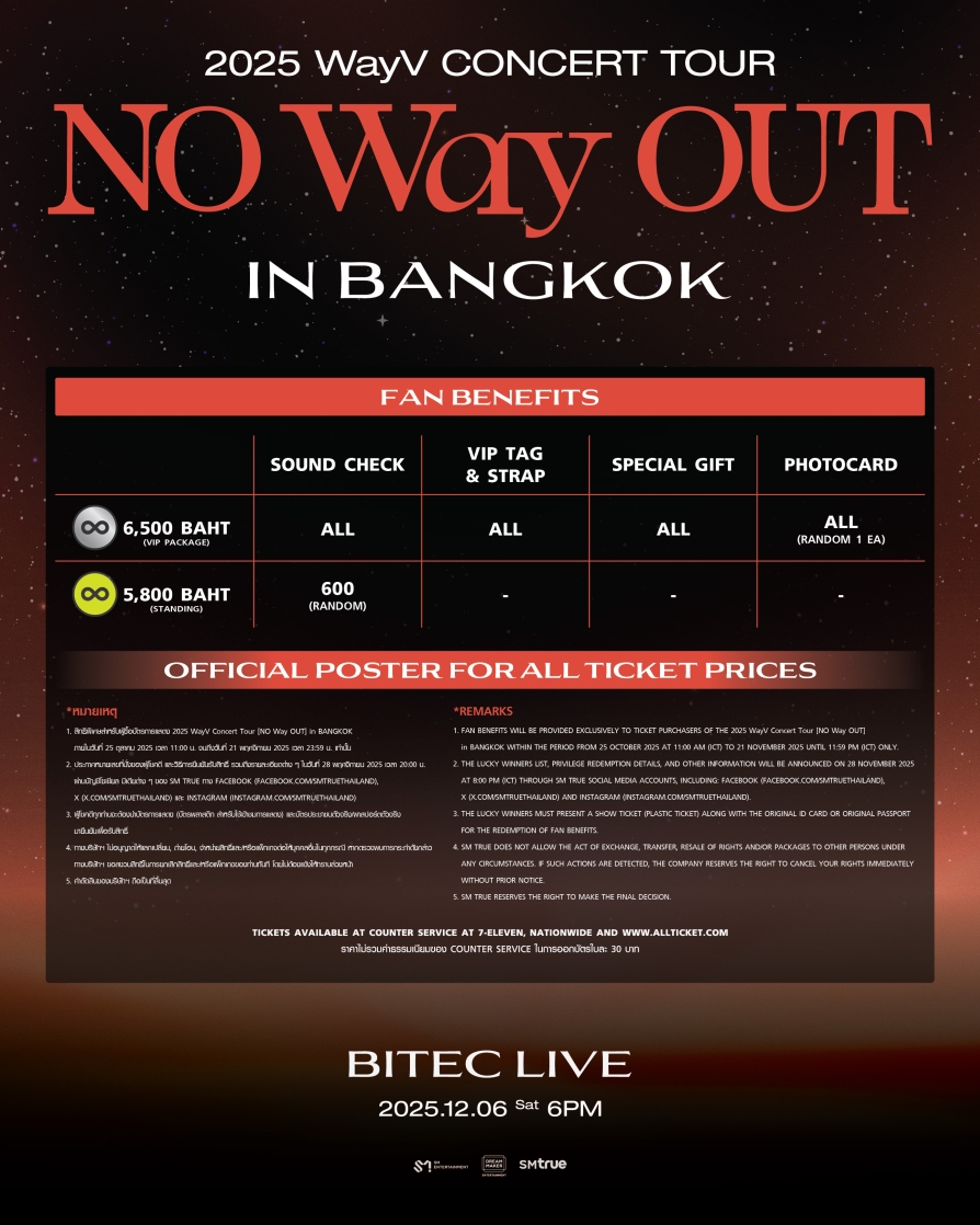 เปิดจำหน่ายบัตรแล้ววันนี้ ทางเคาน์เตอร์เซอร์วิสในร้าน 7-Eleven ทุกสาขาทั่วประเทศ และทางเว็บไซต์ www.allticket.com/event/WayV_NOWayOUT_BANGKOK พร้อมสิทธิพิเศษสำหรับผู้ซื้อบัตร
