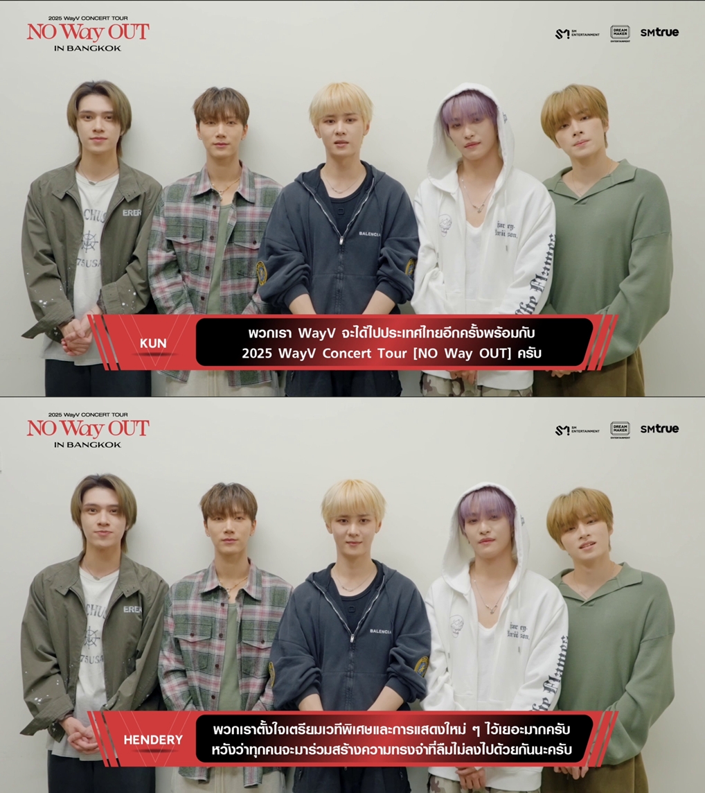 “สวัสดีครับ พวกเรา WayV (เวย์วี) ครับ พวกเรามีข่าวดีจะมาบอกครับ พวกเรา WayV (เวย์วี) จะได้ไปประเทศไทยอีกครั้งพร้อมกับ 2025 WayV Concert Tour [NO Way OUT] ครับ พวกเราตื่นเต้นมาก ๆ ที่จะได้เจอแฟน ๆ ชาวไทยอีกครั้งครับ ในครั้งนี้ 2025 WayV Concert Tour [NO Way OUT] in BANGKOK จะจัดขึ้นในวันเสาร์ที่ 6 ธันวาคม เวลา 6 โมงเย็น ที่ BITEC LIVE ครับ พวกเราตั้งใจเตรียมเวทีพิเศษและการแสดงใหม่ ๆ ไว้เยอะมากครับ หวังว่าทุกคนจะมาร่วมสร้างความทรงจำที่ลืมไม่ลงไปด้วยกันนะครับ พวกเรากำลังตั้งตารอวันที่จะได้พบกับทุกคนครับ แล้วมาสนุกกับ WayV (เวย์วี) ที่คอนเสิร์ตนะครับ”