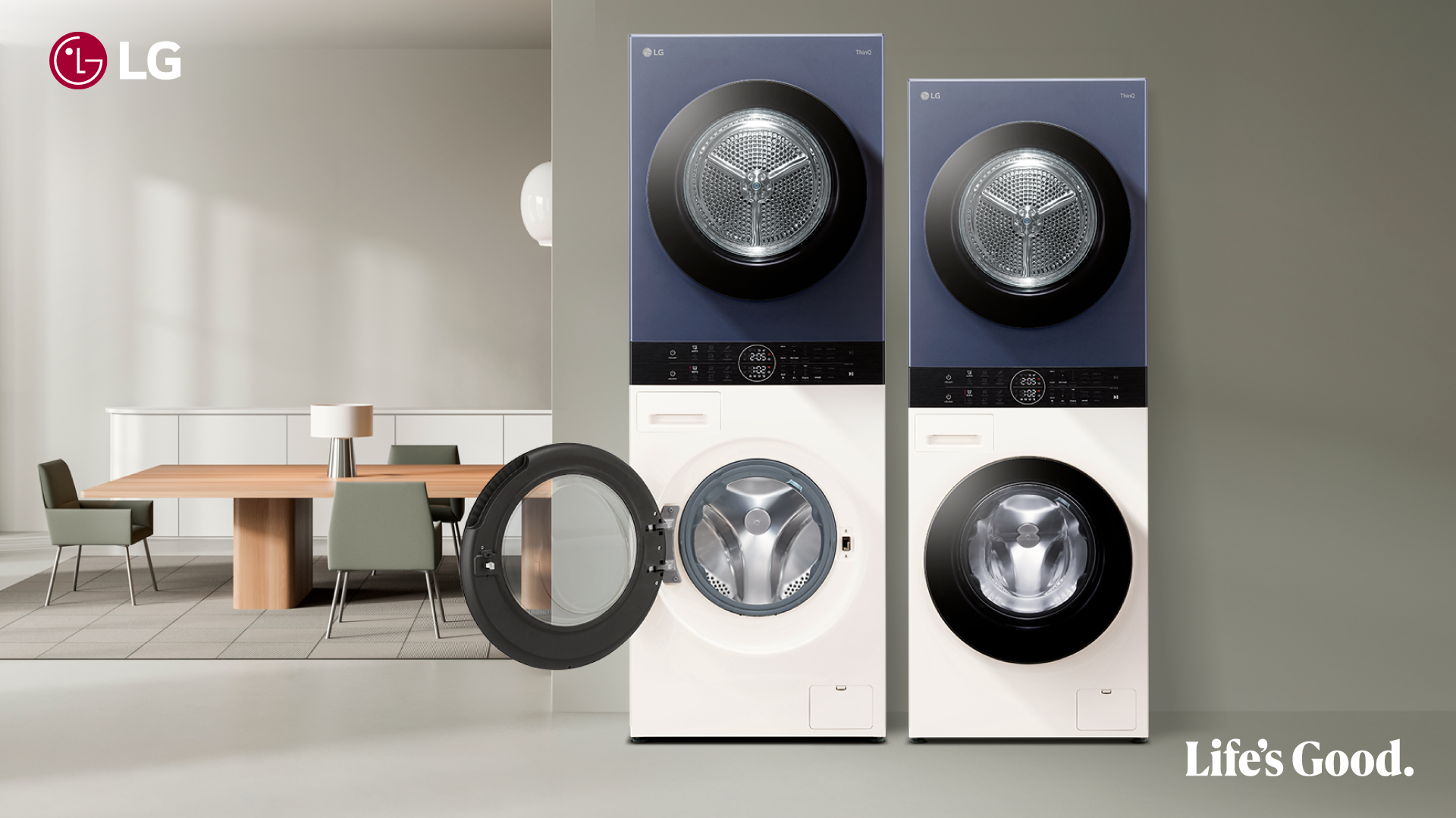 LG WashTower (25 และ 20 กก.) ที่รวมเครื่องซักและอบไว้ในเครื่องเดียวพร้อมแผงควบคุม Center Panel, เครื่องซักผ้าฝาหน้า LG Front Load ที่เพิ่มความจุและระบบจ่ายน้ำยาอัตโนมัติ ezDispense หรือ