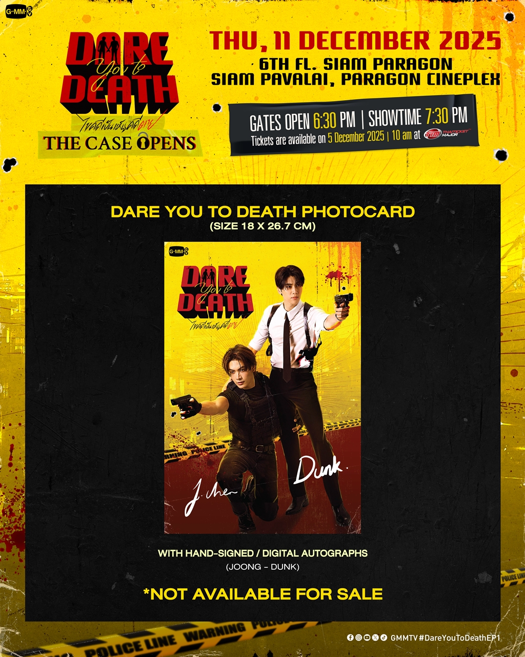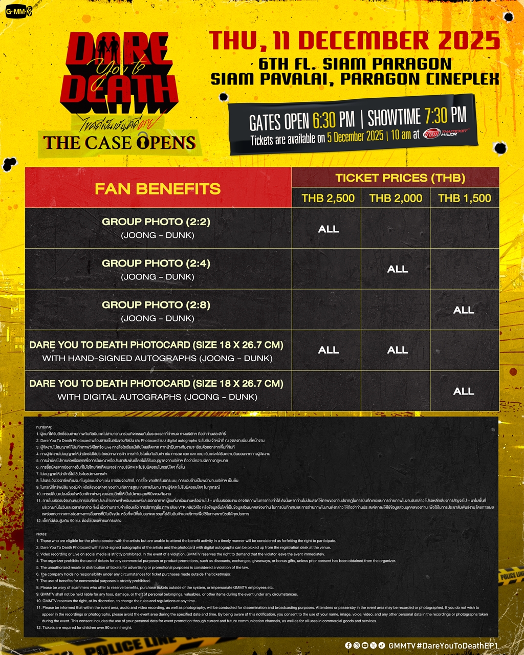 สำหรับผู้ที่สนใจสามารถจองบัตรเข้าร่วมงาน “Dare You to Death : The Case Opens” เปิดจำหน่ายบัตร ในวันศุกร์ที่ 5 ธันวาคม 2568 เวลา 10.00 น. เป็นต้นไป บัตรราคา 2,500 / 2,000 / 1,500 บาท ที่ ไทยทิคเก็ตเมเจอร์ทุกสาขา, www.thaiticketmajor.com และ Call Center โทร 0-2262-3456 หรือสามารถติดตามรายละเอียดเพิ่มเติมได้ที่เว็บไซต์ www.thaiticketmajor.com Facebook : www.facebook.com/gmmtvofficial และ Instagram & X & TikTok & YouTube & Weibo : GMMTV
