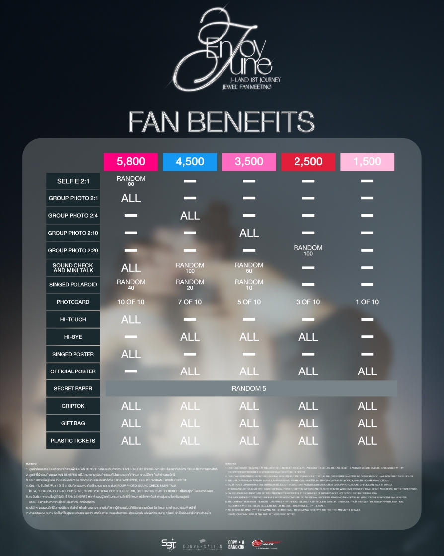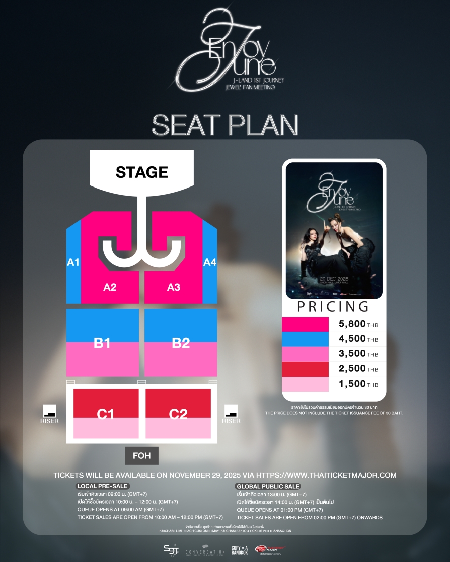 งานนี้สองสาว “เอนจอย-จูน” การันตีว่าพร้อมเสิร์ฟโชว์สุดเอ็กซ์คลูซีฟ และโมเมนต์สุดฟินให้ได้ฮ็อปกันอย่างเต็มที่แน่นอน โดยจะเริ่มจำหน่ายบัตรในวันเสาร์ที่ 29 พฤศจิกายน นี้ทาง www.thaiticketmajor.com ราคาบัตร: 5,800 / 4,500 / 3,500 / 2,500 และ 1,500 บาท สำหรับรอบการจำหน่ายบัตรนั้นมี 2 รอบเวลาดังนี้ รอบ LOCAL PRE-SALE: เวลา 10:00 – 12:00 น. และ รอบ GLOBAL PUBLIC SALE: เวลา 14:00 น. เป็นต้นไป