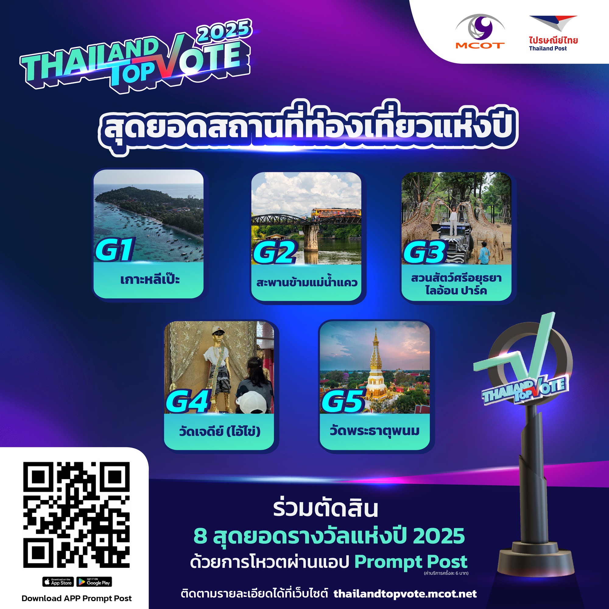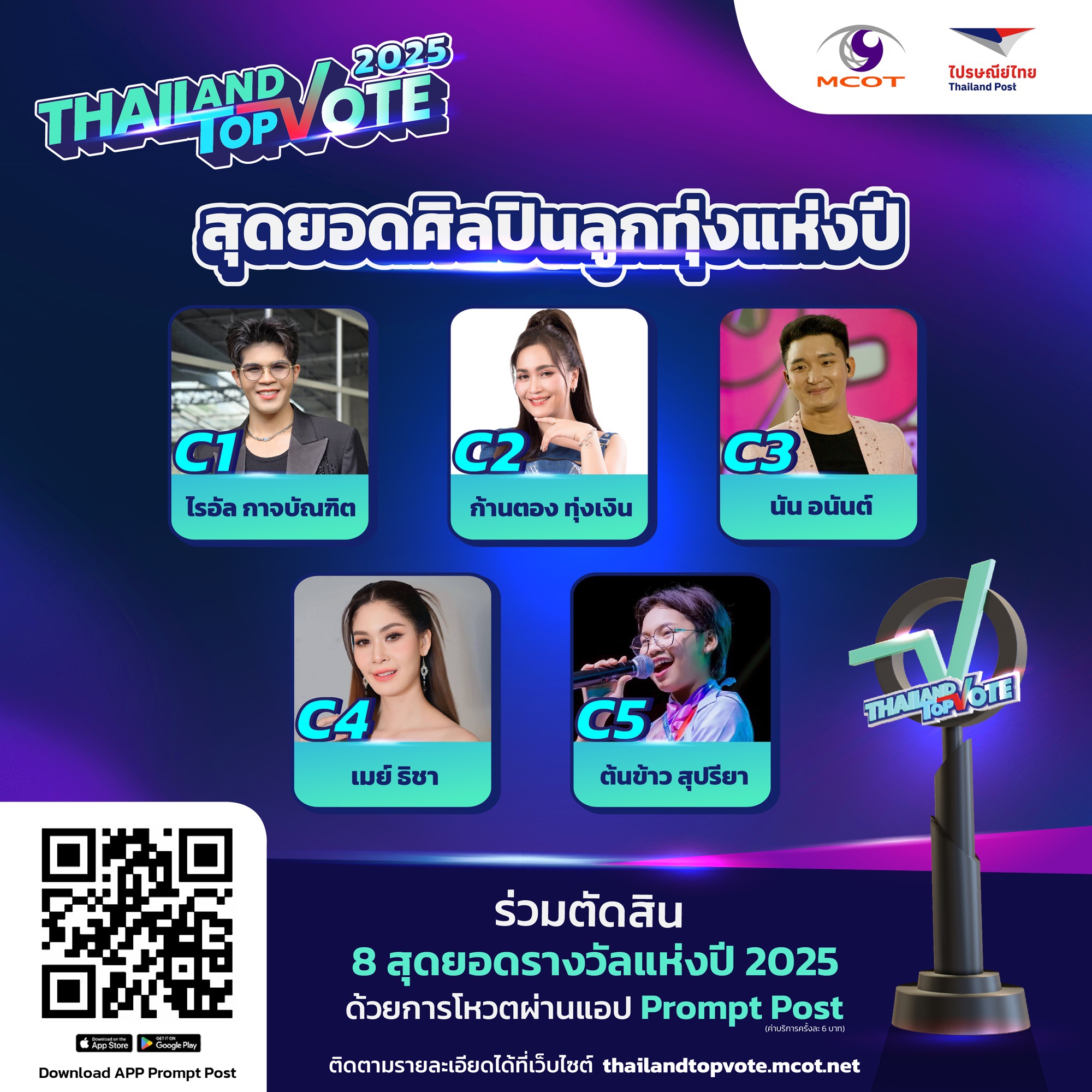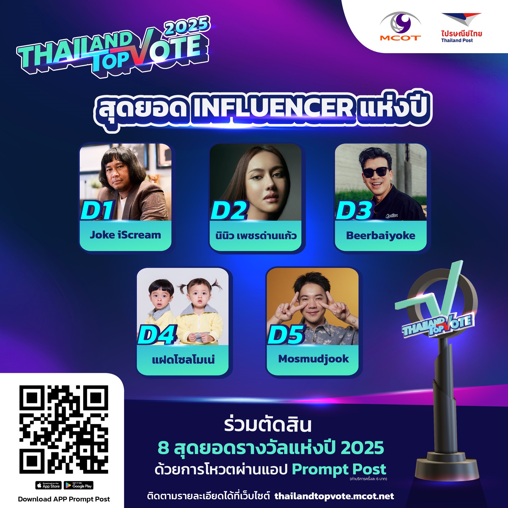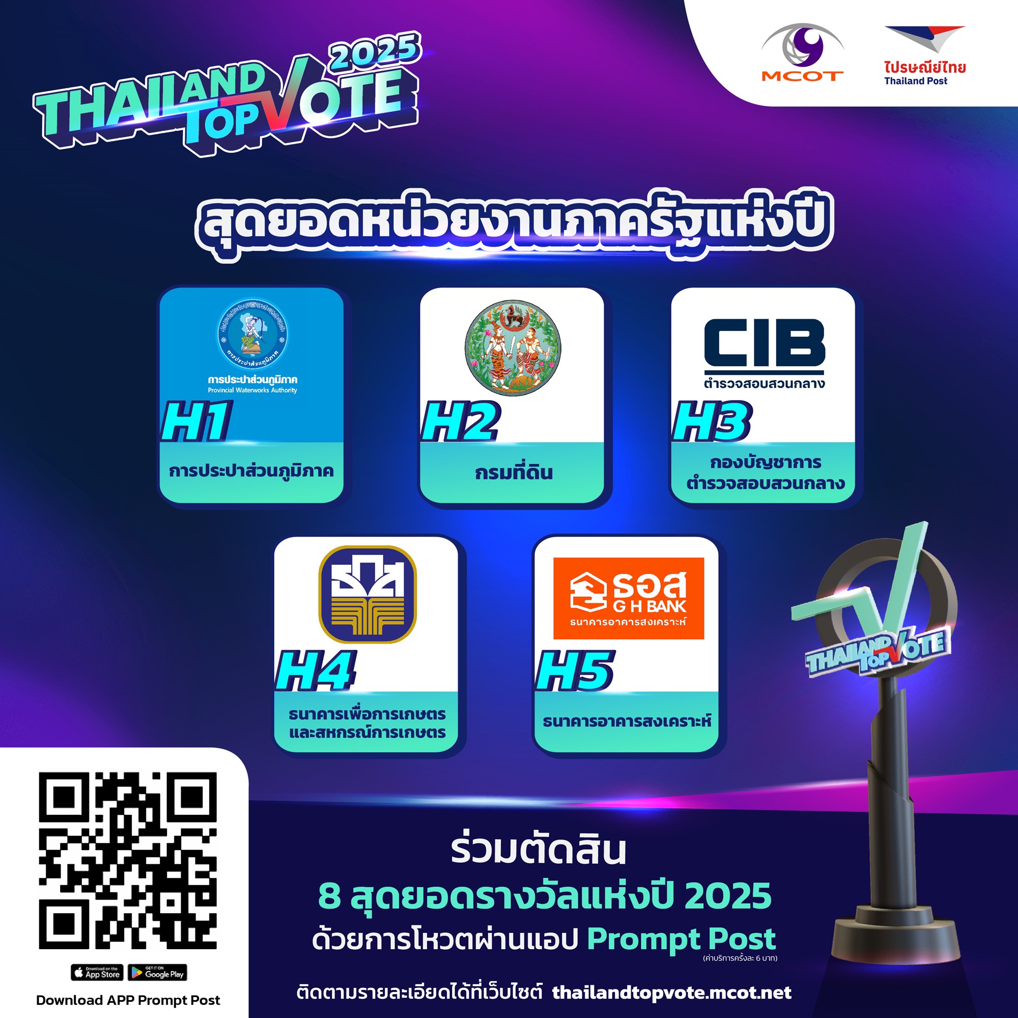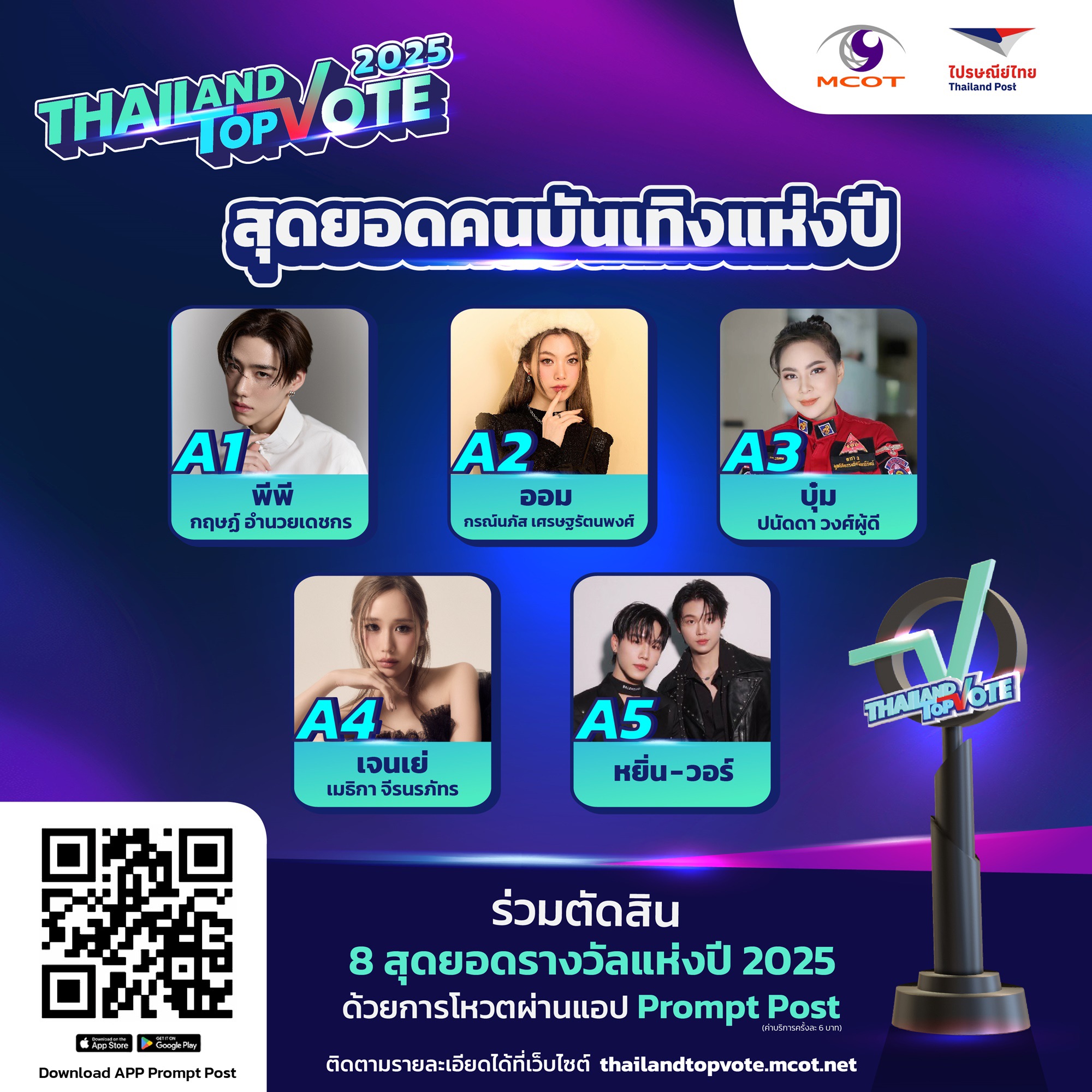 พร้อมเปิดโผ เปิดโหวต 8 สาขารางวัล TOP 5 ของประเทศ กับ “Thailand Top Vote 2025” VOICES OF WORTH เสียงแห่งคุณค่า รางวัลที่สร้างความภาคภูมิใจ สร้างแรงบันดาลใจ พร้อมกำลังใจ ให้กับบุคคลและองค์กรในหลากหลายวงการ จากการร่วมมือระหว่าง บริษัท อสมท จำกัด (มหาชน) และ บริษัท ไปรษณีย์ไทย จำกัด กับ 8 รางวัลที่มาจากการโหวตของคนทั้งประเทศ พร้อม 2 รางวัลเกียรติยศ สุดยอดนักบริหารแห่งปีจากภาครัฐและภาคเอกชน จากการคัดเลือกจากคณะกรรมการผู้ทรงคุณวุฒิ โดยมีสถาบันบัณฑิตพัฒน บริหารศาสตร์ (นิด้า) สนับสนุนการทำโพล และผู้ที่ก้าวเข้าสู่ TOP 5 ของประเทศ ในแต่ละสาขา จากเสียงที่อยู่ในใจของคุณ มาเป็นเสียงแห่งคุณค่า