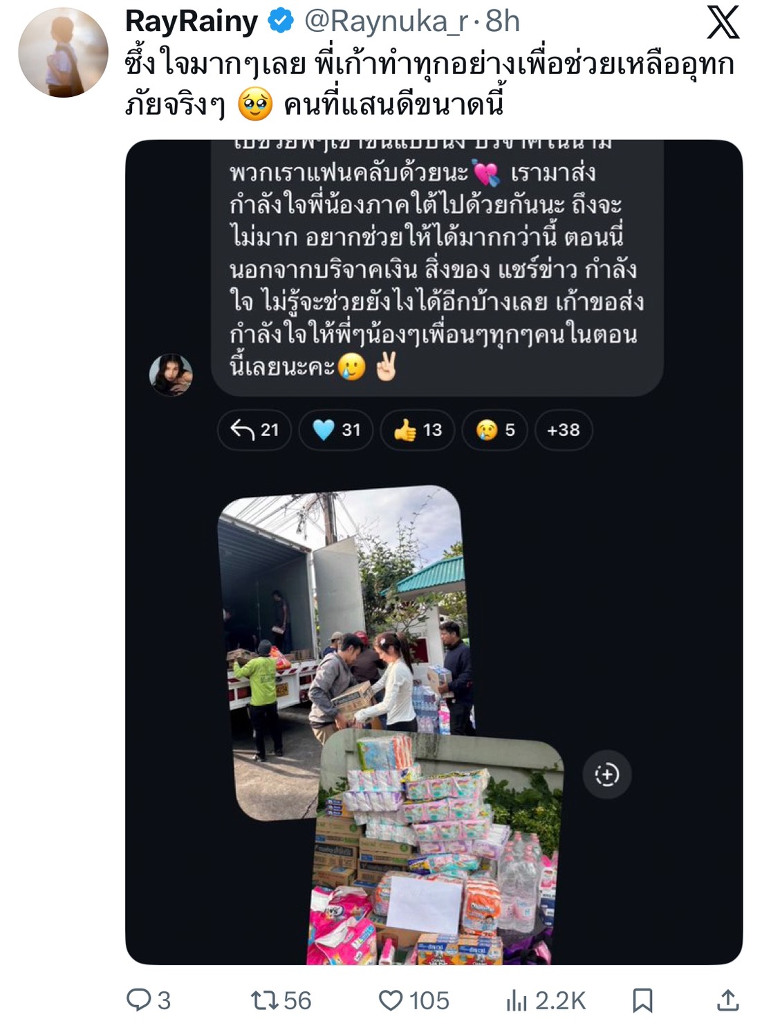 ไม่เพียงเท่านั้น เก้า ยังจัดส่งของบริจาคเลือกซื้อเลือกของใช้จำเป็นด้วยตัวเอง ใช้ชื่อแฟนคลับ “ด้อม 9779” มาร่วมบุญด้วยกัน เพื่อช่วยเหลือผู้ประสบภัยที่หาดใหญ่ และสตูล โดยได้มีการส่งมอบสิ่งของบริจาคที่ LOOKE ซอยนวมินทร์ 40 เพื่อเตรียมส่งต่อไปยังพื้นที่ที่ได้รับความเดือดร้อนอีกด้วย พร้อมเผยข้อความใน Official ส่วนตัวว่า ตนและแฟนคลับขอส่งต่อกำลังใจและทรัพยากรที่จำเป็นไปสู่พี่น้องชาวใต้เพื่อให้ผ่านพ้นวิกฤตครั้งนี้ไปได้โดยเร็ว