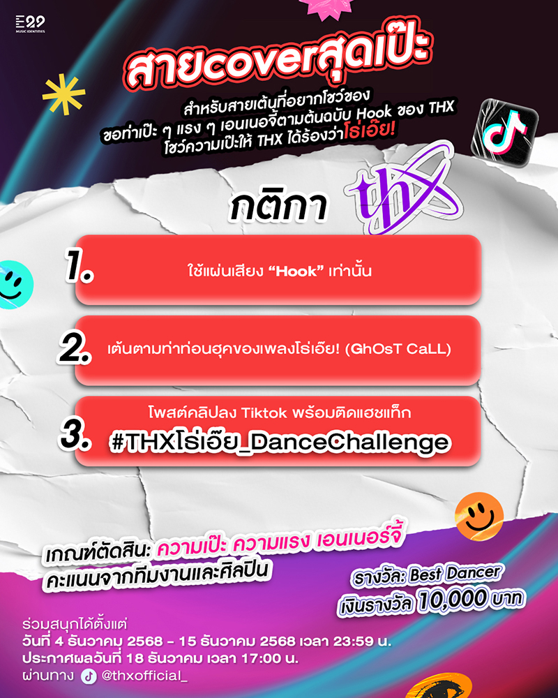 กระแสแรงเกินต้าน! หลังจากท่าเต้นท่อนฮุคของเพลง “โธ่เอ๊ย (GhOsT CaLL)” ถูกปล่อยบน TikTok ก็กลายเป็นไวรัลแบบรวดเร็ว ศิลปิน อินฟลูเอ็นเซอร์ และสายแดนซ์จากทุกมุมฟีด ต่างยกกันมาคัฟเวอร์แผ่นเสียง โชว์สเต็ปแบบไม่มีใครยอมใคร! ทำให้ E29 Music Identities เปิดแคมเปญใหญ่ “THX โธ่เอ๊ย Challenge” เชิญทุกคนมาปล่อยพลังความมันบน TikTok พร้อม 3 แผ่นเสียงให้เลือกเล่น, 3 ประเภทการแข่งขัน, และ ของรางวัลรวมกว่า 85,212 บาท!