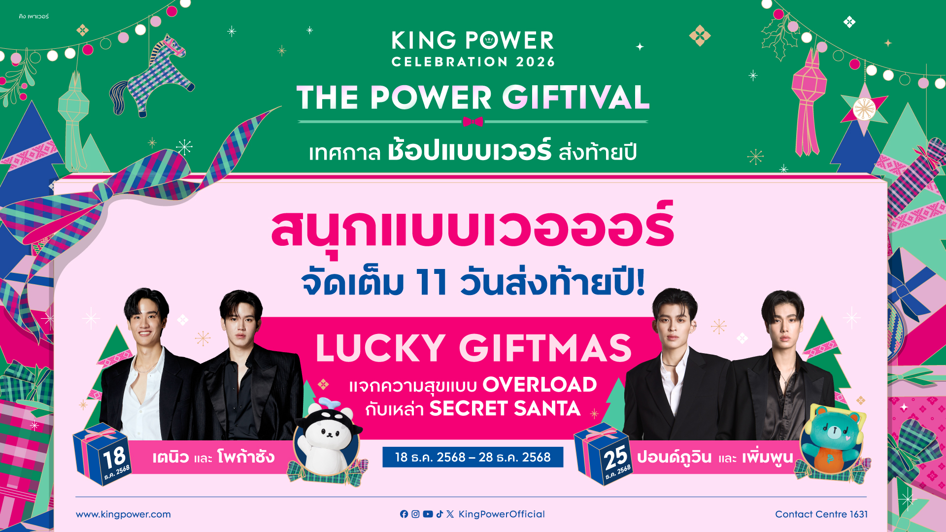 คิง เพาเวอร์ ต้อนรับเทศกาลแห่งความสุข ชวน 2 คู่สุดฮอตและลูก ๆ ร่วมกิจกรรม LUCKY GIFTMAS ในงาน “KING POWER CELEBRATION 2026 THE POWER GIFTIVAL เทศกาล ช้อปแบบเวอร์ ส่งท้ายปี” วันที่ 18 ธันวาคม 2568 พบกับ เต ตะวัน-นิว ฐิติภูมิและโพก้าซัง วันที่ 25 ธันวาคม 2568 พบกับปอนด์ ณราวิชญ์ – ภูวินทร์ และเพิ่มพูน มอบสิทธิพิเศษเฉพาะสมาชิก POWER PASS ช้อปสินค้าครบทุก ๆ 500 บาท (เฉพาะวันที่ 18 และ 25 ธันวาคม 2568) รับ 1 สิทธิ์ ร่วมสนุกเป็น 1 ใน 50 ผู้โชคดี ร่วมกิจกรรมสุดเอกซ์คลูซิฟกับศิลปินคนโปรด ที่ คิง เพาเวอร์ รางน้ำ