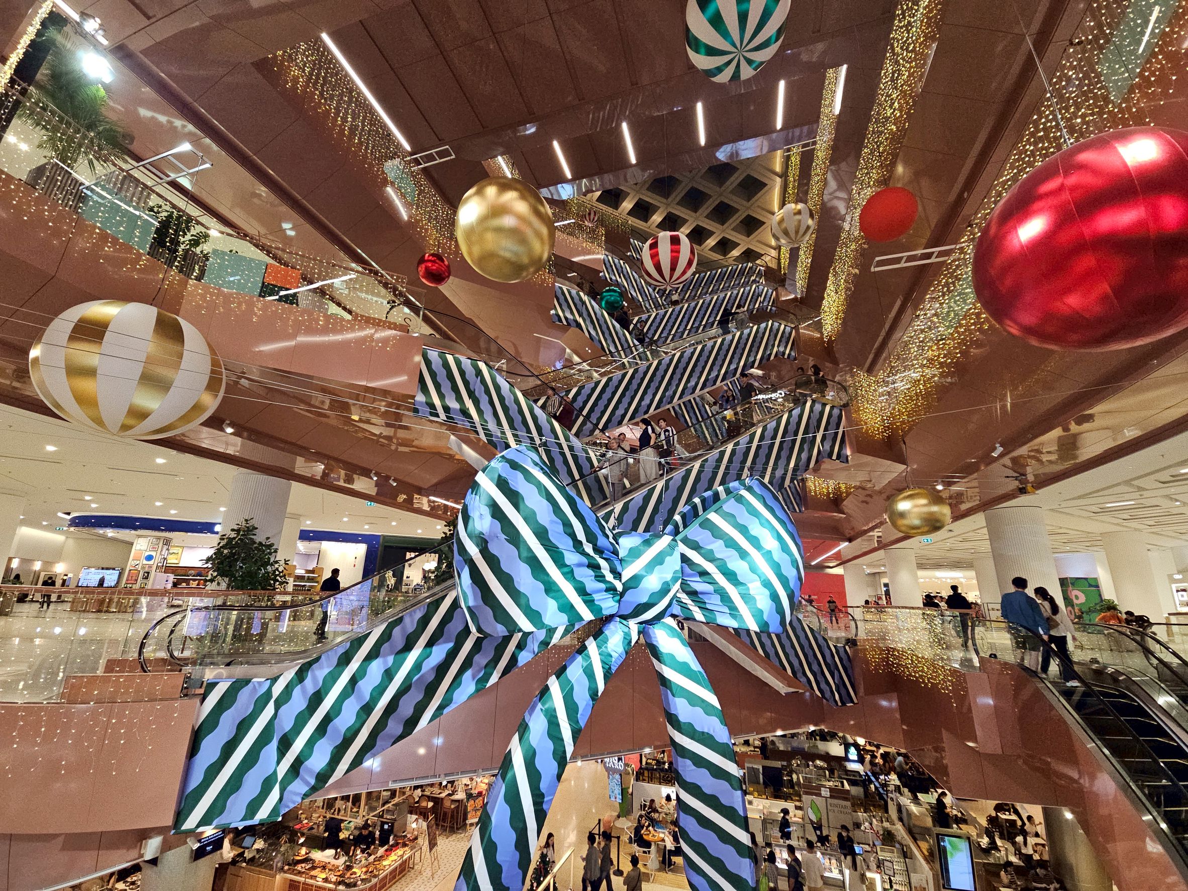 นอกจาก Christmas tree – The Velvet Pine ต้นคริสต์มาสที่ใช้ “ผ้ากำมะหยี่” (Velvet) มาสร้างมิติซ้อนทับกันเป็นเลเยอร์ มอบความรู้สึกพิเศษแต่อบอุ่น ด้วยผิวสัมผัสที่นุ่มนวลและโทนสีที่เปลี่ยนไปตามแสงเงาแล้ว ยังมีจุดตกแต่งอย่าง “ระฆังผ้า The Soft Bells” แขวนประดับกระจายตัวอยู่อย่างมีจังหวะ เหมือนระฆังกำลังส่งเสียงกึกก้อง ระฆังผ้าเหล่านี้ช่วยเติมเต็มรายละเอียดที่นุ่มนวลให้กับพื้นที่ พร้อมข้อความดีๆ มอบคำอวยพรให้แก่ผู้พบเห็น สร้างบรรยากาศที่ดูใกล้ชิดและเป็นกันเองท่ามกลางโถงขนาดใหญ่ และ ”ริบบิ้นกราฟิก The Embracing Ribbon” เส้นสายที่พาดผ่านและเชื่อมโยงพื้นที่จุดตัดของบันไดเลื่อน ทำให้ตัวสถาปัตยกรรมภายในทั้งหมดดูเหมือน “กล่องของขวัญที่กำลังถูกห่อ” ให้กับทุกๆ คน
