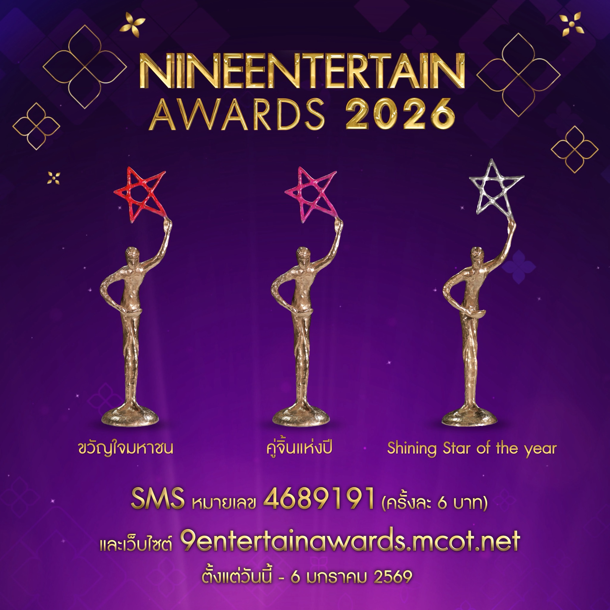ร่วมเป็นส่วนหนึ่งของรางวัล“NINEENTERTAIN AWARDS 2026” (ไนน์เอ็นเตอร์เทนอวอร์ด 2026) Rise of Thainess เปล่งประกายความเป็นไทยสู่สากล และสามารถติดตามรายละเอียดเพิ่มเติมได้ใน รายการไนน์เอ็นเตอร์เทน ทาง ช่อง 9 กด 30 , https://nineentertain.mcot.net, www.facebook.com/9entertainและ YouTube: NineEntertain Official