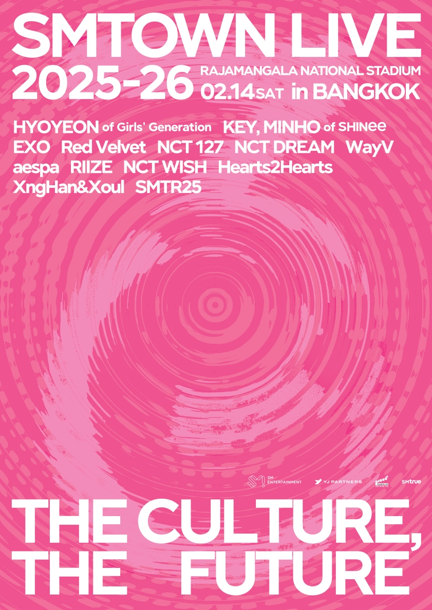 ค่ายผู้บุกเบิกเค-ป็อป SM ENTERTAINMENT (เอสเอ็ม เอนเทอร์เทนเมนต์) พร้อมยกขบวนศิลปินที่ครองใจแฟนคลับชาวไทยมาอย่างยาวนานกว่า 13 ทีมมาจัดเต็มความสนุกในคอนเสิร์ตสุดยิ่งใหญ่ที่ทั้งประเทศรอคอย ‘SMTOWN LIVE 2025-26 [THE CULTURE, THE FUTURE] in BANGKOK’ (เอสเอ็มทาวน์ ไลฟ์ ทูเธาซันด์ทเวนตี้ไฟว์–ทเวนตี้ซิกซ์ [เดอะ คัลเจอร์, เดอะ ฟิวเจอร์] อิน แบงค็อก) ซึ่งมีกำหนดจัดขึ้นอย่างอลังการในวันเสาร์ที่ 14 กุมภาพันธ์ 2026 เวลา 18:00 น. ณ สเตเดียมที่ใหญ่ที่สุดในประเทศไทย ‘ราชมังคลากีฬาสถาน’