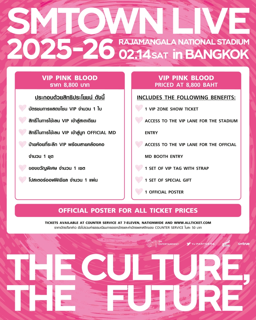 แฟนคลับชาวไทยเตรียมตัวพบกับหลากหลายเวทีสุดพิเศษที่สามารถรับชมได้เฉพาะที่ ‘SMTOWN LIVE’ เท่านั้น ห้ามพลาดที่จะมาร่วมสัมผัสพลังของดนตรีที่สืบทอดกันมายาวนาน ดื่มด่ำกับเสียงร้องที่เฝ้ารอ ผ่านโชว์สุดตระการตาและเพลงฮิตที่คิดถึง ที่จะทำให้ทุกช่วงเวลาถูกบันทึกไว้ในใจอย่างตราตรึงตลอดไป กับคอนเสิร์ต ‘SMTOWN LIVE 2025-26 [THE CULTURE, THE FUTURE] in BANGKOK’ เปิดจำหน่ายบัตรรอบสมาชิก “SM ARTIST official Fanclub” Membership (GL) Pre-Sale ในวันเสาร์ที่ 20 ธันวาคม 2025 เวลา 10:00 น. – 16:00 น. และรอบบุคคลทั่วไป วันอาทิตย์ที่ 21 ธันวาคม 2025 ตั้งแต่เวลา 10:00 น. เป็นต้นไป ทางเคาน์เตอร์เซอร์วิสในร้าน 7-Eleven ทุกสาขาทั่วประเทศ และทางเว็บไซต์ www.allticket.com/event/SMTOWNLIVE2026inBKK บัตรราคา (บัตรนั่งทั้งหมด) 8,800 (VIP PINK BLOOD) / 7,500 / 6,800 / 6,300 / 5,800 / 4,400 / 3,800 / 3,300 / 2,800 บาท พร้อมรับออฟฟิเชียลโปสเตอร์ทุกที่นั่ง ติดตามข่าวสารของคอนเสิร์ตได้ทางบัญชีโซเชียลมีเดียต่าง ๆ ของ SM True : เฟซบุ๊ก facebook.com/smtruethailand, อินสตาแกรม instagram.com/smtruethailand, เอ็กซ์ x.com/SMTrueThailand และ TikTok (ติ๊กต๊อก) tiktok.com/@smtruethailand สอบถามข้อมูลเพิ่มเติมเกี่ยวกับการซื้อบัตรได้ทาง Counter Service : อีเมล support@allticket.com และไลน์ออฟฟิเชียล @counterservice