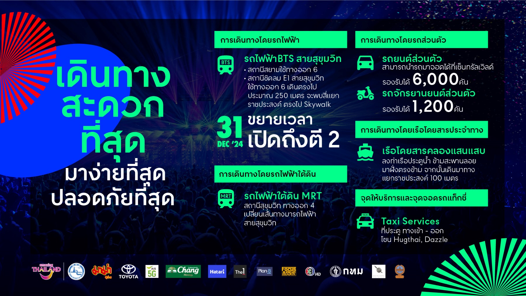 - ครั้งแรกใจกลางเมือง กับ Drone Show ร่วมส่ง Message to the World ตอกย้ำบทบาทเวทีเคานต์ดาวน์ของไทยในฐานะสื่อกลางระดับโลก ผ่านการแสดงโดรนแปรอักษรที่ถ่ายทอดสารแห่งความรัก ความสามัคคี และความหวัง ส่งต่อ Message to the World จากใจกลางกรุงเทพฯ สู่สายตาผู้ชมทั่วโลก