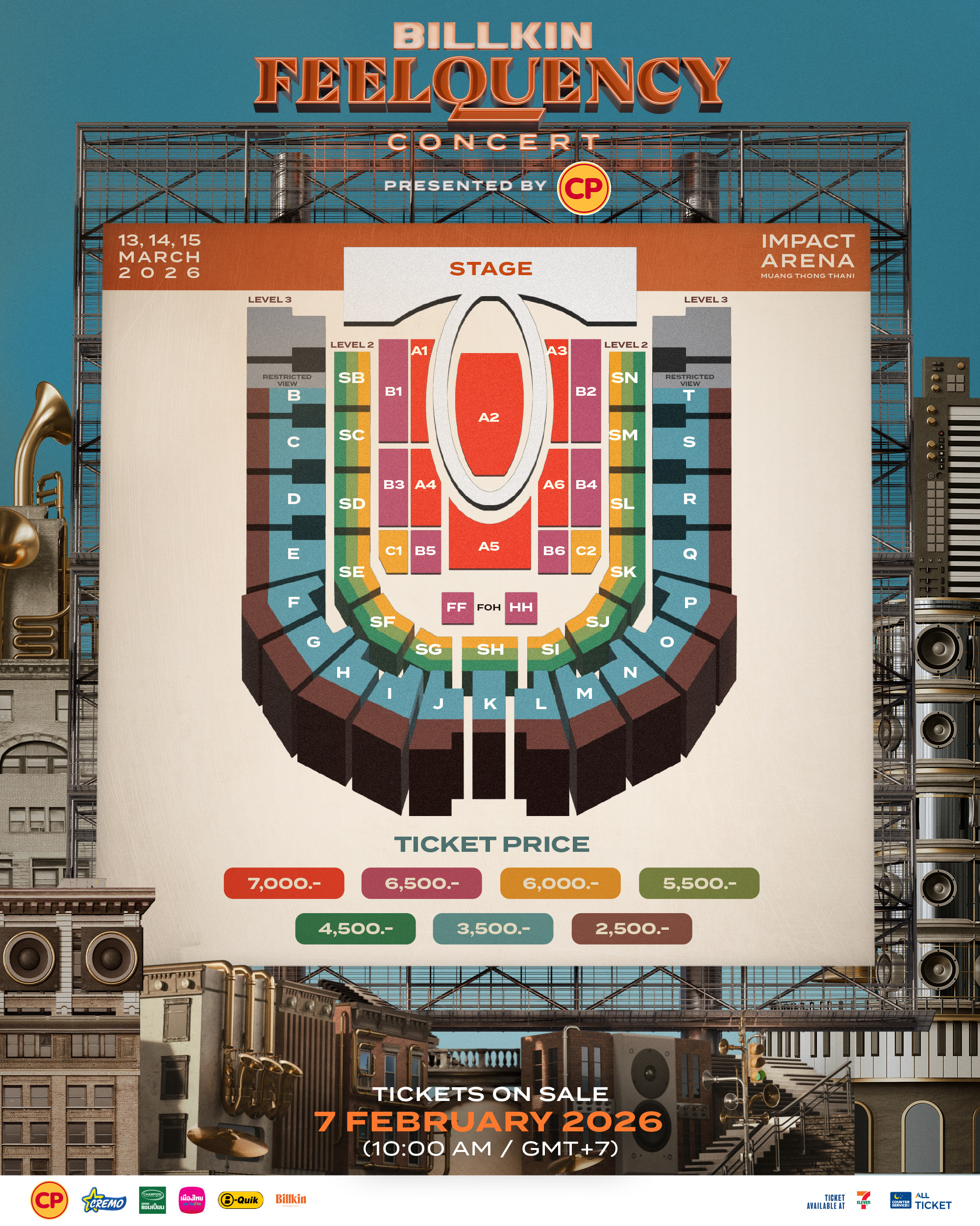 สำหรับแฟนๆ ที่ไม่อยากพลาด สามารถไปสัมผัสความสนุกใน “BILLKIN FEELQUENCY CONCERT PRESENTED BY CP” จัดขึ้นทั้งหมด 3 รอบการแสดง ในวันที่ 13, 14, 15 มีนาคม 2569 ณ อิมแพ็ค อารีน่า เมืองทองธานี จะเปิดขายบัตรในวันที่ 7 กุมภาพันธ์ 2569 ในเวลา 10:00 น. (GMT+7) – 12:00 น. (GMT+7) โดยจะเปิดจำหน่ายเฉพาะที่เคาน์เตอร์เซอร์วิสในร้าน 7-Eleven ทุกสาขาทั่วประเทศ จากนั้นเวลา 12:00 น. (GMT+7) จะเปิดจำหน่ายผ่านทั้งที่เคาน์เตอร์เซอร์วิส และ เว็บไซต์ www.allticket.com โดยบัตรมีราคา ดังนี้ 7,000 บาท / 6,500 บาท / 6,000 บาท / 5,500 บาท / 4,500บาท / 3,500 บาท / 2,500 บาท และ บัตร Live Streaming 1,200 บาท สามารถติดตามรายละเอียดเพิ่มเติมได้ที่ Social Media : Billkin Entertainment