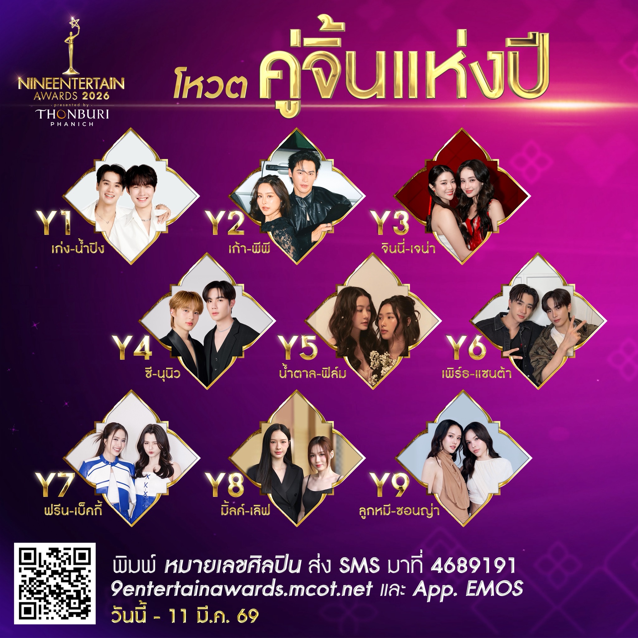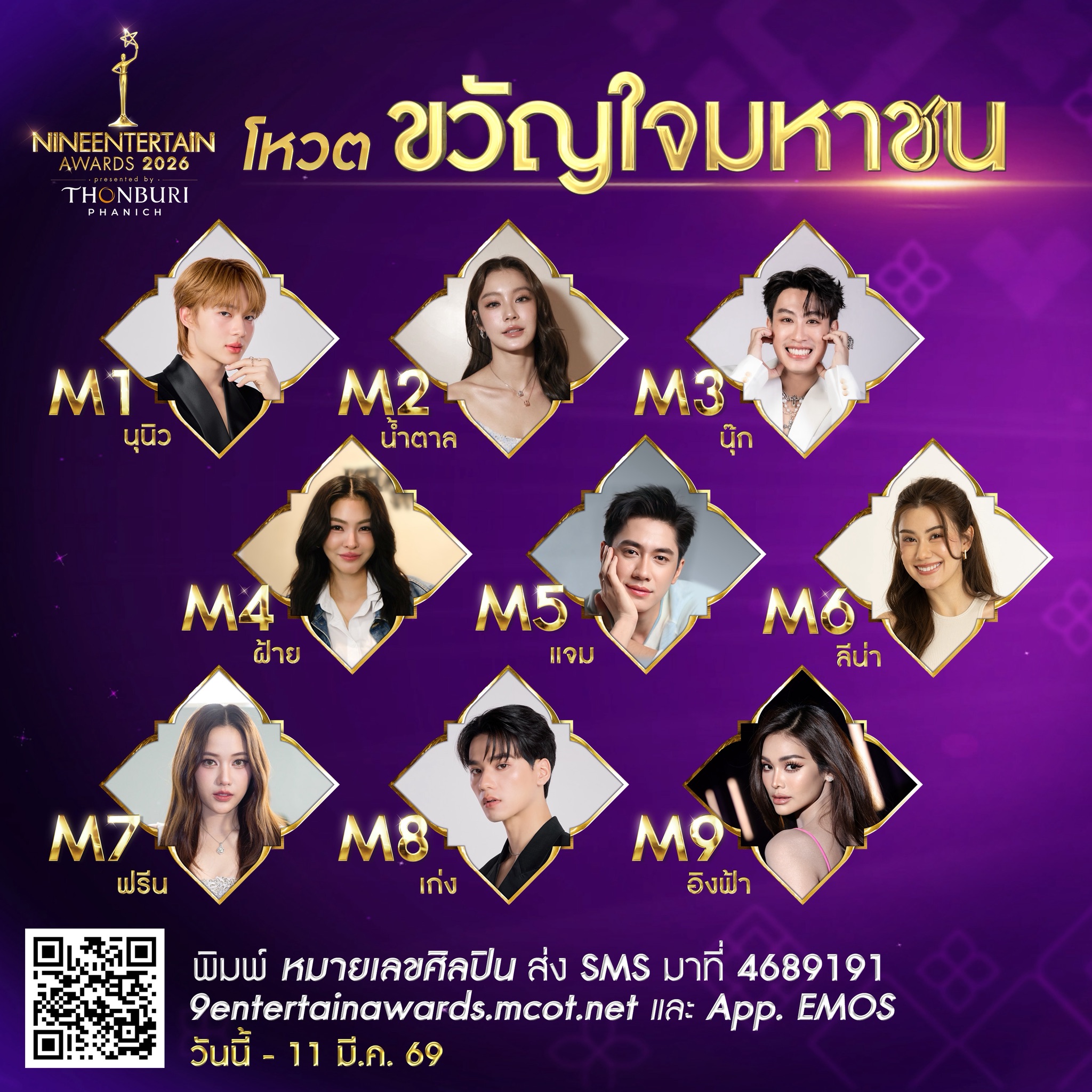 โดยมี 3 สาขาที่คนทั้งประเทศสามารถร่วมโหวตได้ ซึ่งตอนนี้เราได้ผู้ผ่านเข้ารอบที่เป็น TOP 9 ของประเทศ มีทั้งนักแสดงและศิลปิน เริ่มที่ผู้เข้าชิงรางวัลขวัญใจมหาชน M1 นุนิว ชวรินทร์, M2น้ำตาล ทิพนารี, M3 นุ๊ก ธนดล, M4 ฝ้าย พีรญา, M5 แจม รชตะ, M6 ลีน่า ลลินา, M7 ฟรีน สโรชา, M8 เก่ง หฤษฏ์, M9 อิงฟ้า ตามมาด้วยผู้เข้าชิงรางวัลคู่จิ้นแห่งปี Y1เก่ง-น้ำปิง, Y2 เก้า-พีพี, Y3 จินนี่-เจน่า, Y4 ซี-นุนิว, Y5 น้ำตาล-ฟิล์ม, Y6 เพิร์ธ-แซนต้า, Y7 ฟรีน-เบ็คกี้, Y8 มิ้ลค์-เลิฟ, Y9 ลูกหมี-ซอนญ่า และผู้เข้าชิงรางวัล Shining Star of the Year S1 เก่ง-น้ำปิง, S2 จิมมี่-ซี, S3 ตี๋ตี๋-ป๋อ, S4 แตงกวา-เหนือ, S5 เติ้ล-เฟิร์สวัน, S6 ปอนด์-ภูวินทร์, S7 ลีน่า-หมิว, S8 อู่อู๋-เซฟ, S9 เอนจอย-จูน ซึ่งตอนนี้สามารถร่วมโหวตผู้เข้าชิงทั้ง 3 สาขาที่ชื่นชอบได้แล้วนะครับ ได้ 2 ช่องทางและได้แบบไม่จำกัดจำนวนครั้ง ส่ง SMS มาที่หมายเลข 4689191 และทางเว็บไซต์ https://9entertainawards.mcot.net”