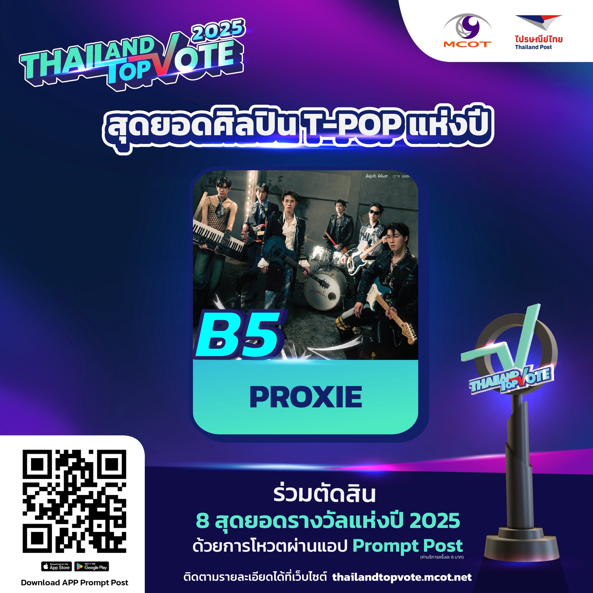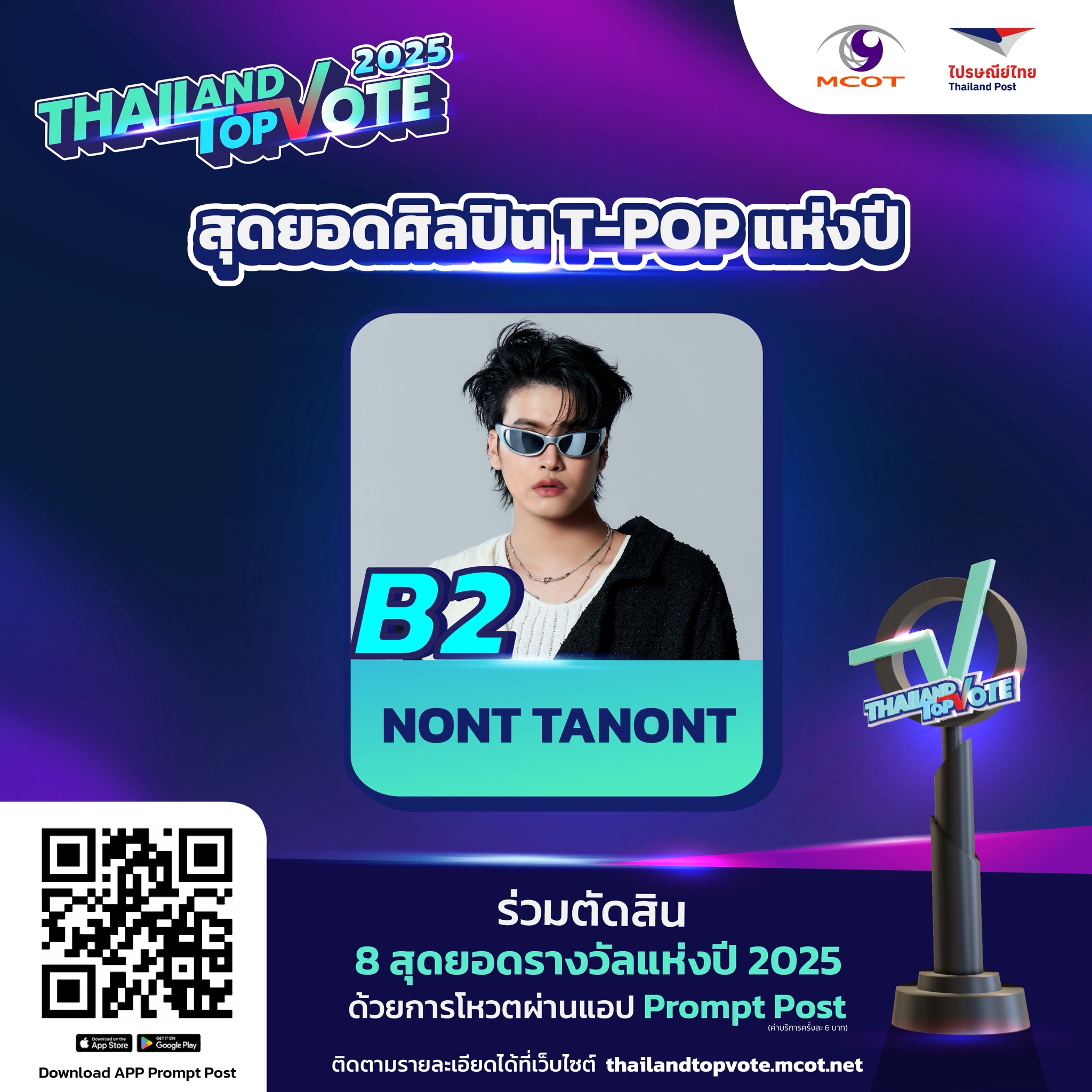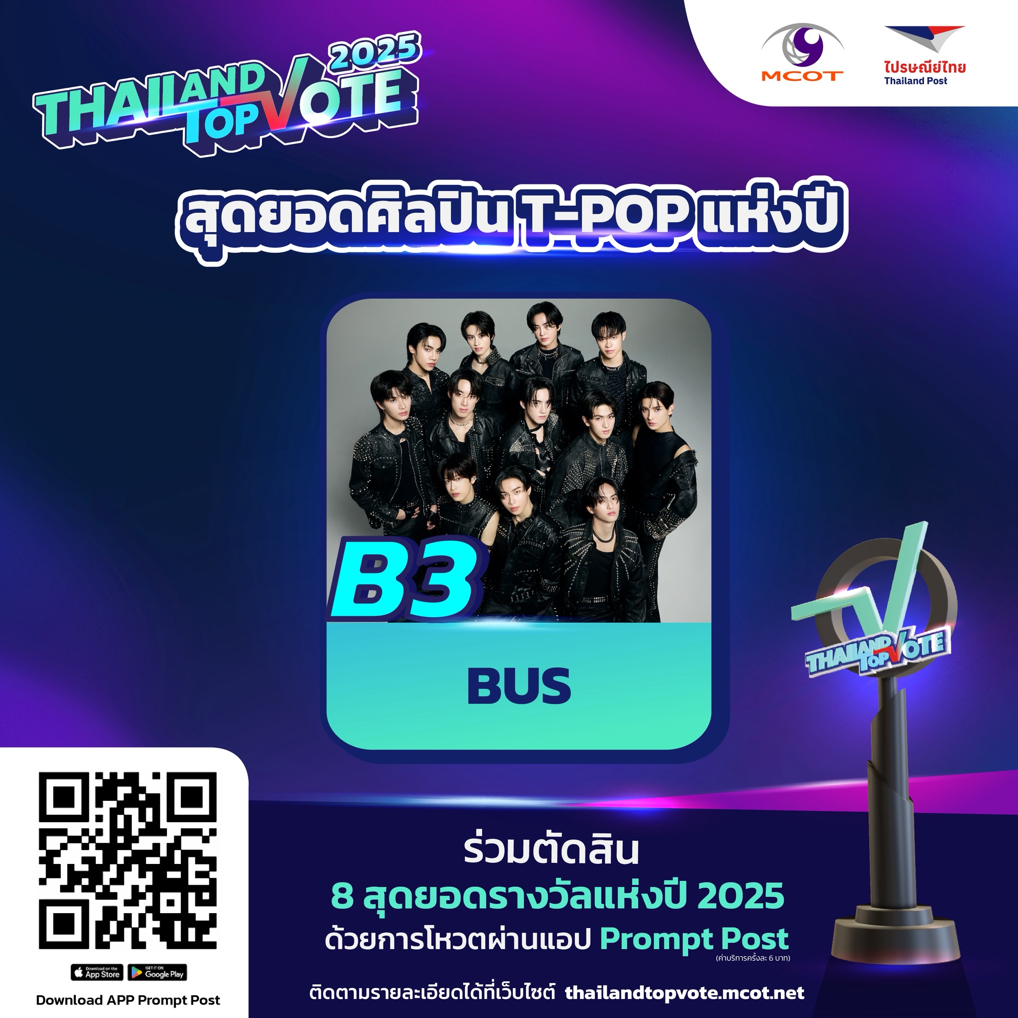 เอ็นดูใครสุดหัวใจ ไม่อยากให้พลาด ร่วมโหวตแบบมีสไตล์ กับรางวัล “Thailand Top Vote 2025” สไตล์แรก “เปิดให้โหวตฟรี 1 ครั้งต่อวัน” และไม่ใช่ใครก็ได้ที่จะได้ทอง แต่ใครทุกคนมีสิทธ์ได้ถ้าร่วมโหวต กับสไตล์ที่สอง “ทุกสัปดห์ผู้ร่วมโหวตที่มียอดสูงสุด 2 อันดับแรกในทุกสาขารับทองทันที โดยจะมีการแจกทองคำรวมมูลค่า 2 ล้านบาท” ปิดท้ายเตรียมรับรางวัลเพียบจาก “เลขรับโชค” ในโปสการ์ดที่ร่วมโหวต ทุกสไตล์พร้อมให้ร่วมโหวตได้ ทางแอปพลิเคชัน Prompt Post รางวัล “Thailand Top Vote 2025” VOICES OF WORTH เสียงแห่งคุณค่า รางวัลที่สร้างความภาคภูมิใจ สร้างแรงบันดาลใจ พร้อมกำลังใจ ให้กับบุคคลและองค์กรในหลากหลายวงการ จากการร่วมมือระหว่าง บริษัท อสมท จำกัด (มหาชน) และ บริษัท ไปรษณีย์ไทย จำกัด กับ 8 รางวัลที่มาจากการโหวตของคนทั้งประเทศ และผู้ที่ก้าวเข้าสู่ TOP 5 ของประเทศ ในสาขาผู้เข้าชิงสาขารางวัลสุดยอดศิลปิน T- POP แห่งปี จากเสียงที่อยู่ในใจของคุณ มาเป็นเสียงแห่งคุณค่า B1 DEXX B2 Nont Tanont B3 BUS B4 BamBam B5 PROXIE สามารถติดตามกติกาเพิ่มเติมและร่วมเป็นส่วนหนึ่งของรางวัล “Thailand Top Vote 2025” ได้ทาง https://thailandtopvote.mcot.net/ #ThailandTopVote2025 #MCOT #ช่อง9กด30 #ไปรษณีย์ไทย #PromptPost