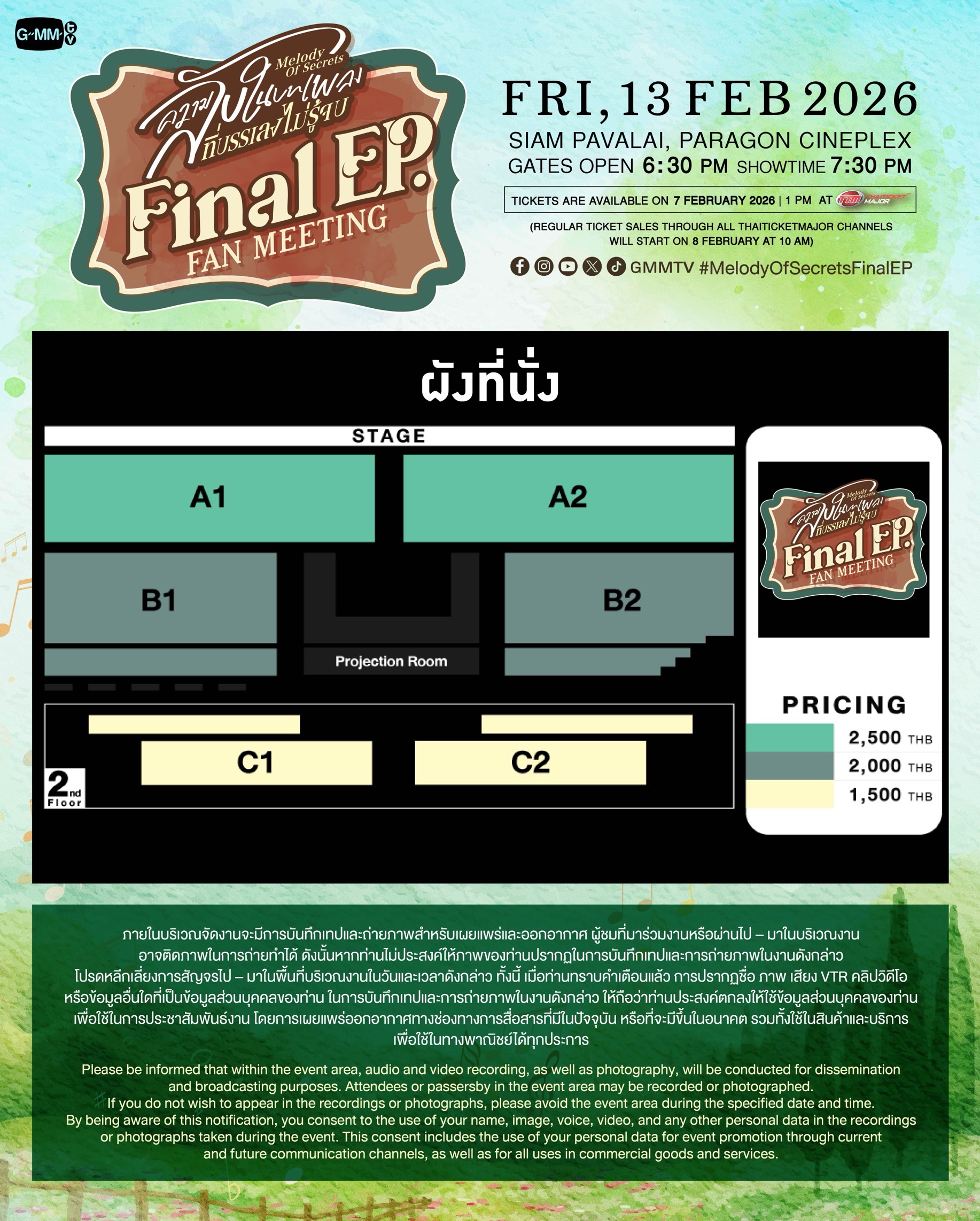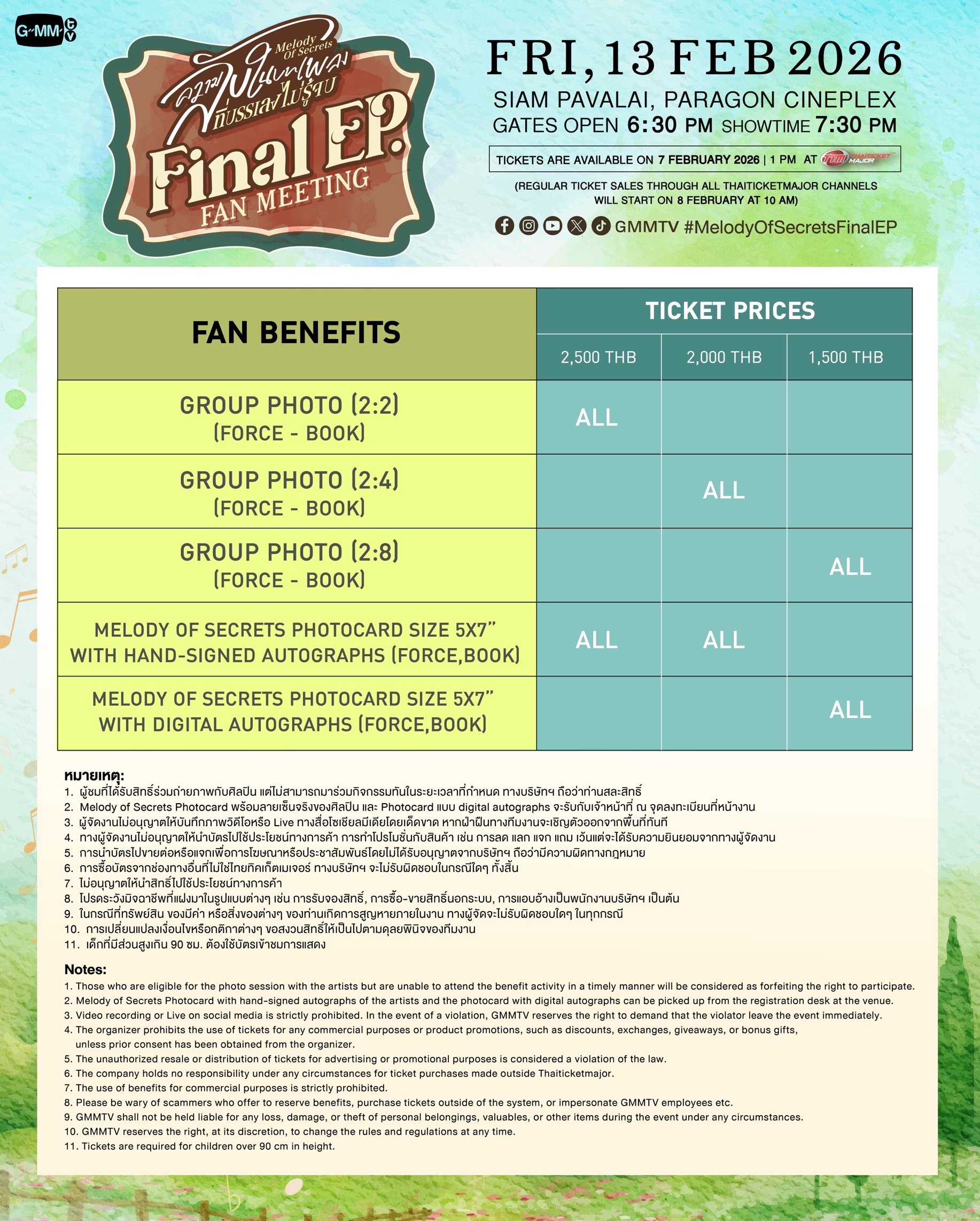 สำหรับผู้ที่สนใจสามารถจับจองบัตรเข้าร่วมงาน “ความลับในบทเพลงที่บรรเลงไม่รู้จบ Final EP. FAN MEETING” โดยเปิดจำหน่ายบัตร บนช่องทาง Online ในวันเสาร์ที่ 7 กุมภาพันธ์นี้ เวลา 13.00 น. เป็นต้นไป และเปิดจำหน่ายบัตร ทุกช่องทางตามปกติ ในวันอาทิตย์ที่ 8กุมภาพันธ์ 2569 เวลา 10.00 น. เป็นต้นไป บัตรราคา 2,500/ 2,000 / 1,500 บาท ทางไทยทิคเก็ตเมเจอร์ทุกสาขา, www.thaiticketmajor.com และ Call Center โทร0–2262-3456 ติดตามรายละเอียดเพิ่มเติมได้ที่เว็บไซต์ : www.thaiticketmajor.com Facebook : www.facebook.com/gmmtvofficial และ Instagram & X & TikTok & YouTube & Weibo : GMMTV