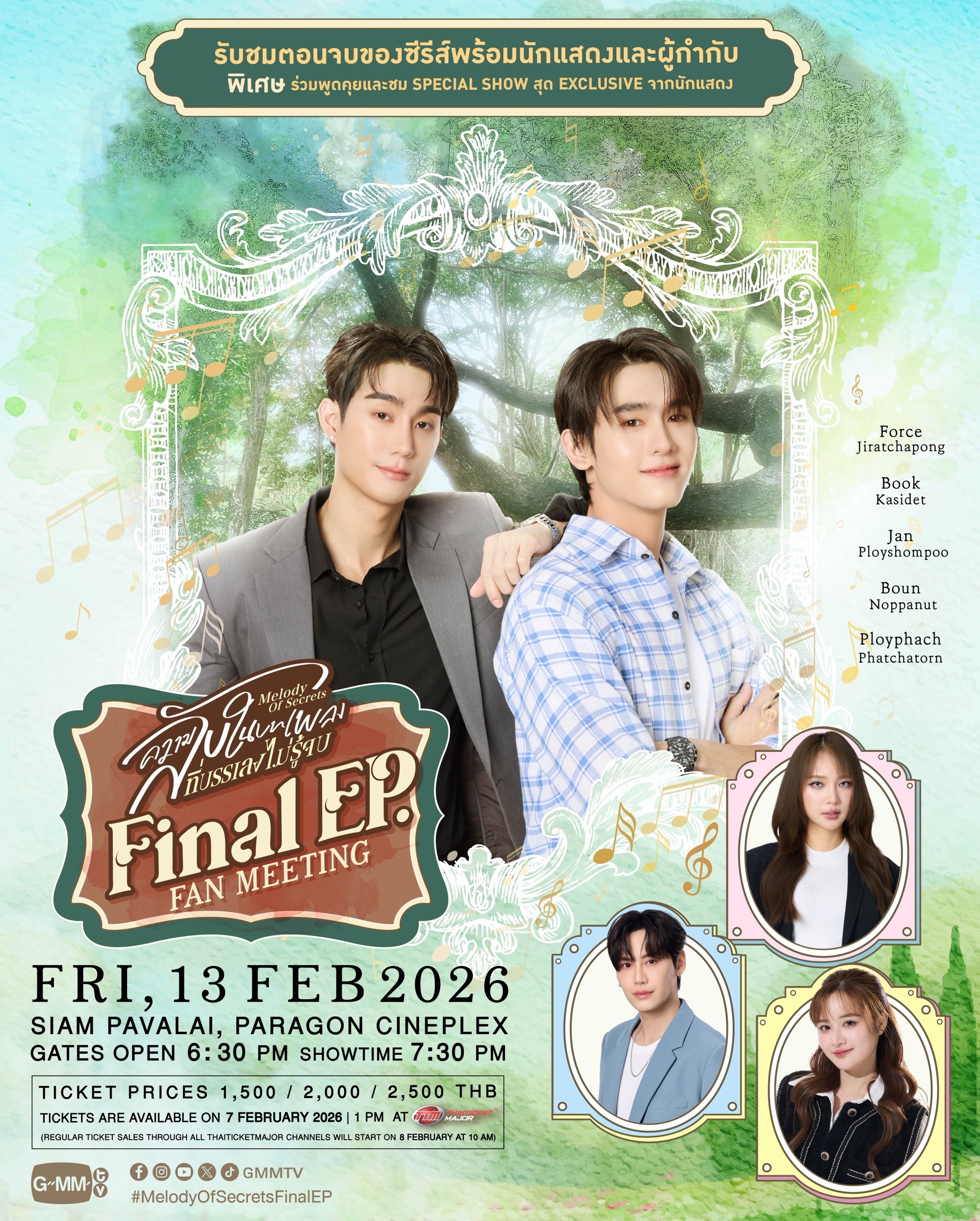 แฟนๆ เตรียมลุ้นระทึกโค้งสุดท้ายกับบทสรุปตอนจบซีรีส์ “ความลับในบทเพลงที่บรรเลงไม่รู้จบ Melody of Secrets” จาก “GMMTV” คอนเทนต์โพรไวเดอร์ชั้นนำของเมืองไทย เรื่องราวความรักที่ซับซ้อนซ่อนปมปริศนาไว้มากมาย ของสองนักแสดง สุดปัง “ฟอส-จิรัชพงศ์ ศรีแสง”และ “บุ๊ค-กษิดิ์เดช ปลูกผล” ที่พวกเขาทั้งคู่จะพาแฟนๆ ไปร่วมสืบหาความลับของบทเพลง กันครั้งสุดท้ายบนจอภาพยนตร์ และร่วมรับชมตอนจบซีรีส์พร้อมกับทีมนักแสดงสุดฮอต “บุ๋น-นพณัฐ กันทะชัย, แจน-พลอยชมพู ศุภทรัพย์, พลอยภัช– ภัชธร ธนวัฒน์” และผู้กำกับฯ คนเก่ง “ตะวันจารุจินดา, อริษา แวววรรณจิตร” พร้อมเตรียมฟินไปกับSpecial Show สุด Exclusive จากเหล่านักแสดง รวมถึงโมเมนต์สุดคิ้วท์ในช่วงการสัมภาษณ์พิเศษ และพูดคุยถึงเบื้องลึกเบื้องหลังซีรีส์สุดอบอุ่น กับงาน “ความลับในบทเพลงที่บรรเลงไม่รู้จบ Final EP. FAN MEETING” ในวันศุกร์ที่ 13 กุมภาพันธ์ 2569 ตั้งแต่เวลา 19.30 น. ณ ชั้น 6สยามพารากอน – โรงภาพยนตร์สยามภาวลัย Paragon Cineplex ที่แฟนๆ ต้องไม่พลาด เพราะรับรองว่างานนี้ทั้งลุ้นทิ้งฟินไม่หยุดแน่นอน