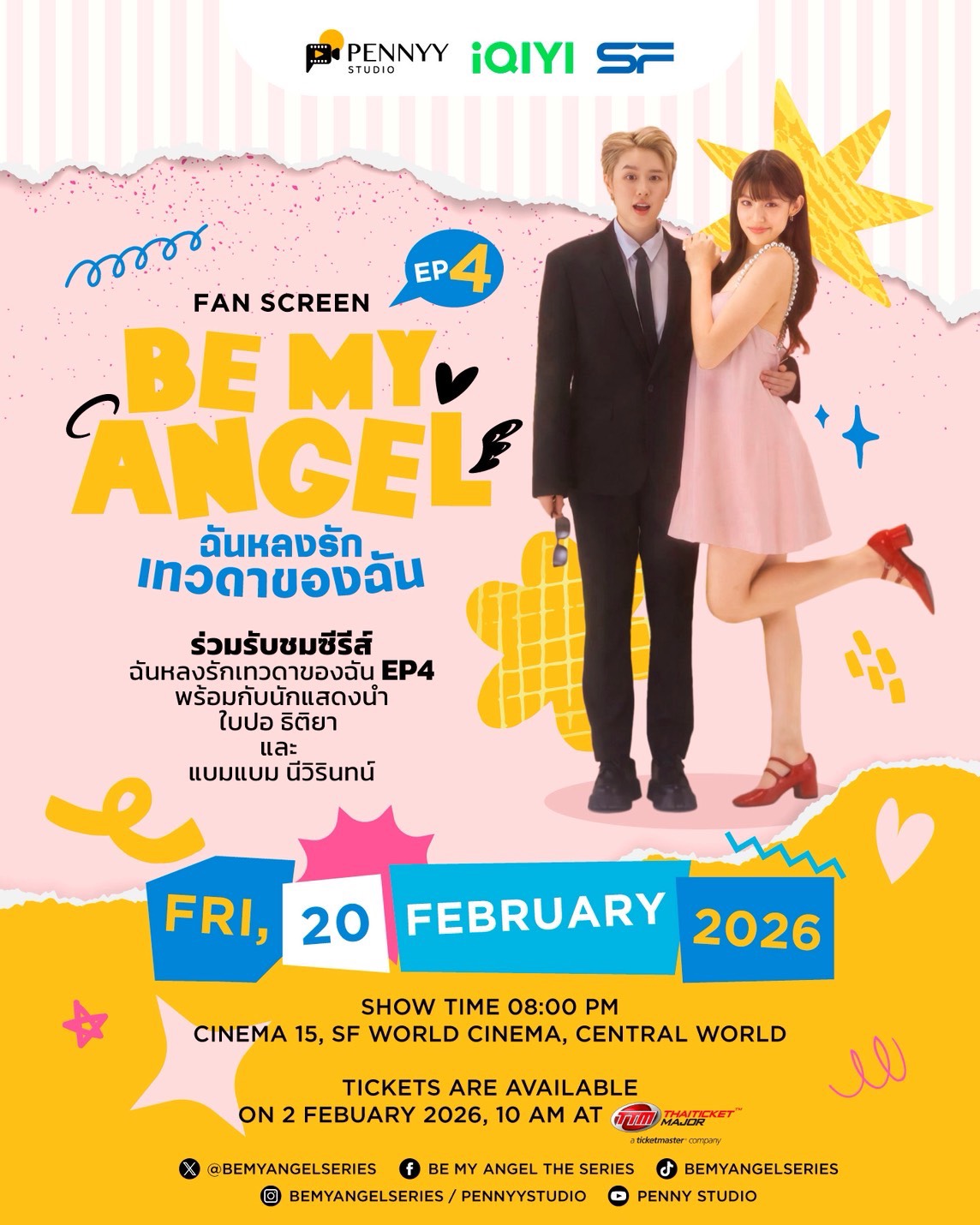 โดยงาน Be My Angel FAN Screen EP.4 จะจัดขึ้นในวันศุกร์ที่ 20 กุมภาพันธ์ 2569 เวลา 18.30 น. ณ โรงภาพยนตร์ SF World Cinema Central World โรง 15 โดยแฟนซีรีส์จะได้ร่วมรับชม EP.4 ที่เข้มข้นขึ้น กับตอน “ฉันต้องไปล่าท้าผีกับเทวดาของฉัน” ชื่อก็บอกแล้วว่าต้องมีอะไรสนุกๆแน่นอน เมื่อการสืบตัวตนของซีกระจ่างขึ้นเรื่อยๆ พวกเขาต้องเจอกับเจ้าของรายการนอนกับผี ทั้งคู่จะต้องทำภารกิจหลอนบางอย่างที่รับรองความสนุกสุดป่วน และที่สำคัญความพิเศษของ Episode นี้ ยังเสิร์ฟโมเมนต์หวานๆ ที่พร้อมจะพาทุกคนอินไปกับความสัมพันธ์ของเจนกับซีที่กำลังพัฒนาขึ้นเรื่อยๆ เรียกได้ว่าต้องฟินจิกหมอนกันทั้งโรงภาพยนตร์ อยากชวนทุกคนมาฟินและกรี๊ดไปพร้อมกับนักแสดงนำ แบมแบม-นีวิรินทน์ ลิ่มกังวาฬมงคล และ ใบปอ-ธิติยา จิระพรศิลป์ พร้อมด้วย แยม-มทิรา ตันติประสุต ในบรรยากาศสุดเอ็กซ์คลูซีฟ ที่อัดแน่นไปด้วยเคมี ความอบอุ่น