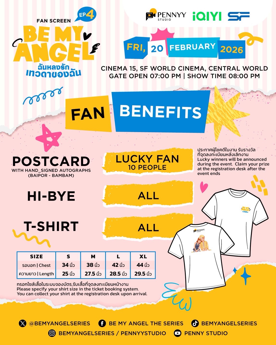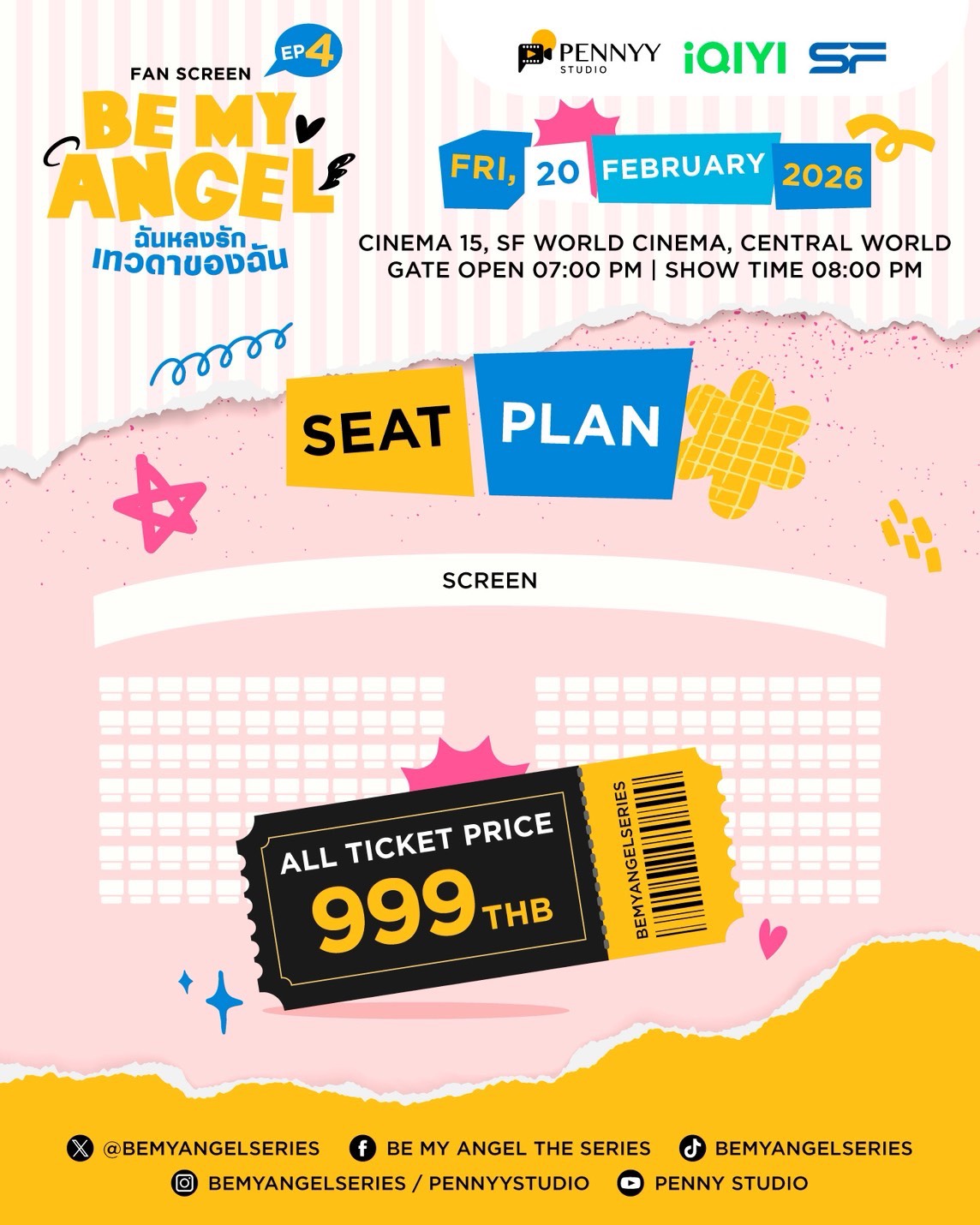 สำหรับแฟนๆ ที่อยากเก็บความทรงจำดีๆ ร่วมกัน งานนี้ถือเป็นโอกาสพิเศษที่ไม่ควรปล่อยให้หลุดมือ บัตรเข้างานจำหน่ายในราคา 999 บาท พร้อมรับเสื้อสุดเอกคลูซีฟทุกที่นั่ง เฉพาะในงานนี้เท่านั้น เตรียมฟินกับทุกโมเมนต์บนจอ ที่จะถูกส่งต่อมาแบบสดๆตรงหน้า ใครที่หลงรักเคมีของตัวละคร และอยากอินไปพร้อมกันแบบเต็มอารมณ์ Be My Angel FAN Screen EP.4 คืออีกหนึ่งงาน ที่แฟนซีรีส์ตัวจริงต้องรีบคว้าบัตรไว้ในมือ