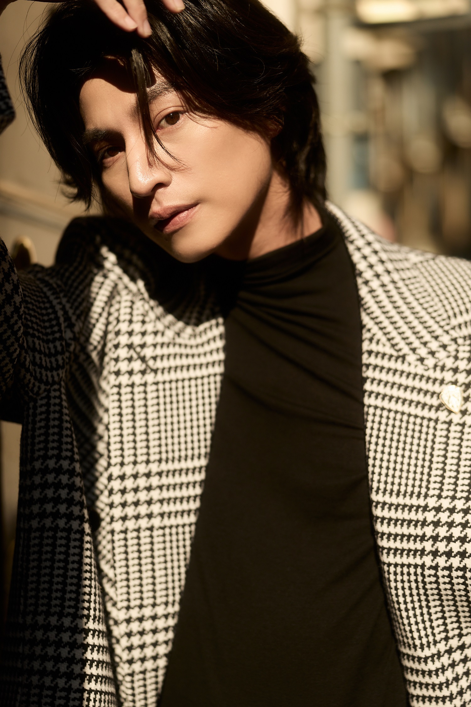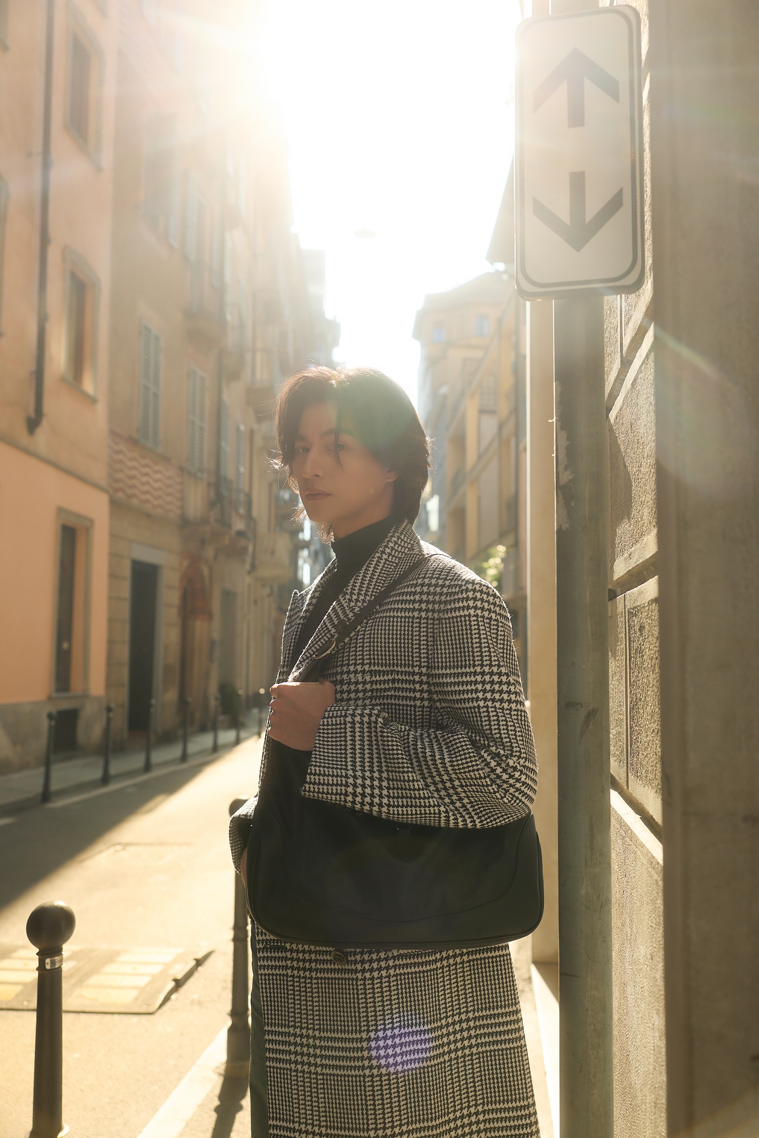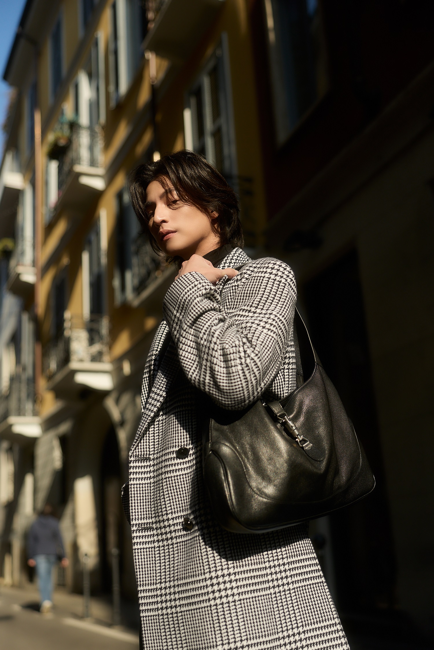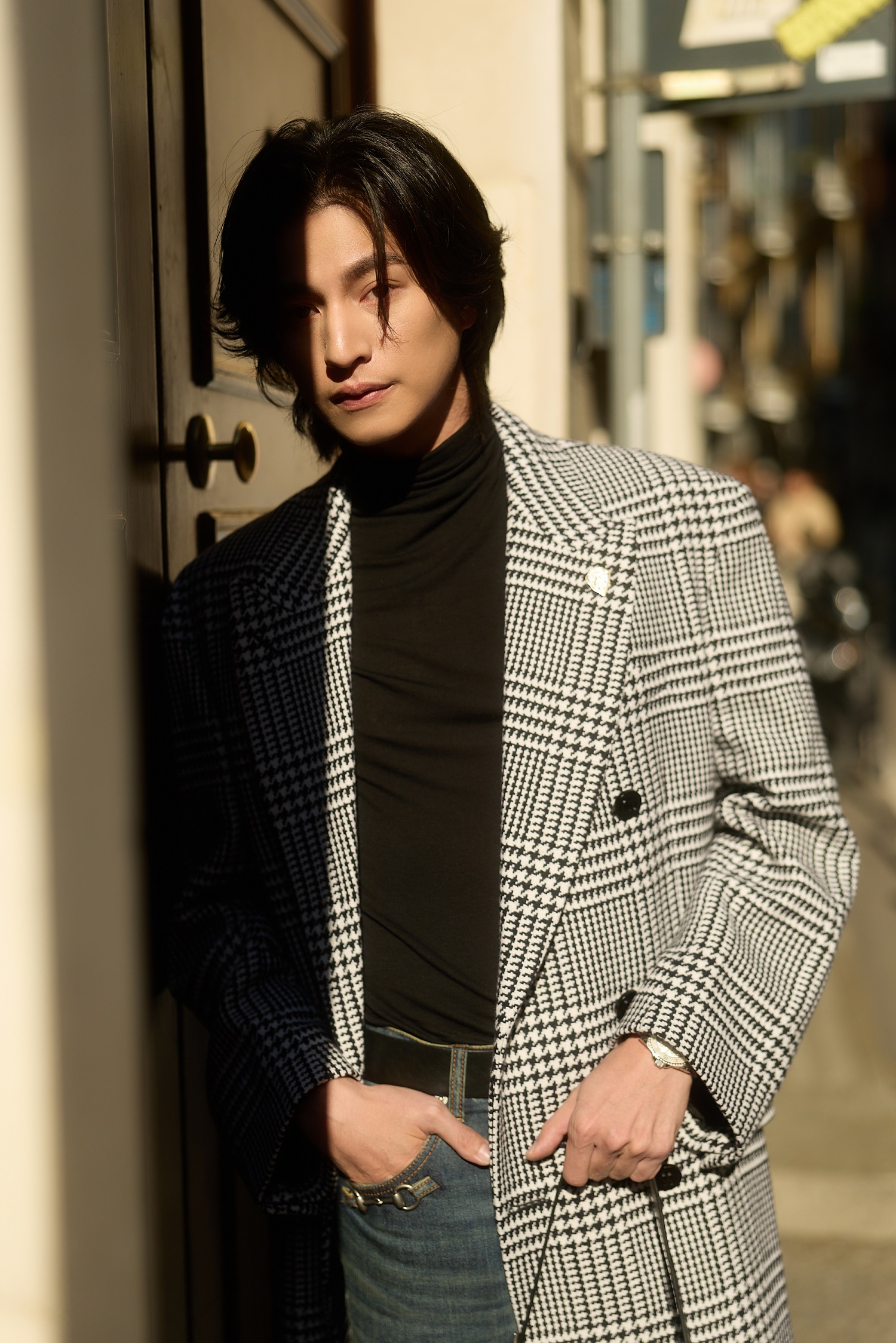 “กลัฟ – คณาวุฒิ” ถ่ายทอดเสน่ห์สุดอบอุ่นในแบบฉบับหนุ่ม Gucci ท่ามกลางไวบ์แสงแดดละมุนของมิลาน ผ่านลุค Cocco di Mamma จากคอลเล็กชั่น La Famiglia ด้วยเสื้อแขนยาวคอเต่าสีดำ จับคู่กางเกงผ้าฝ้ายเดนิมฟอกสีตกแต่งด้วยสัญลักษณ์ Horsebit พร้อมด้วยเสื้อโค้ทผ้าวูลลาย Prince of Wales สีขาว–ดำ ประดับด้วยเข็มกลัด Gucci Crest คอมพลีทลุคด้วยกระเป๋า รุ่น Jackie 1961 และรองเท้า Horsebit Loafer หนังสีดำ