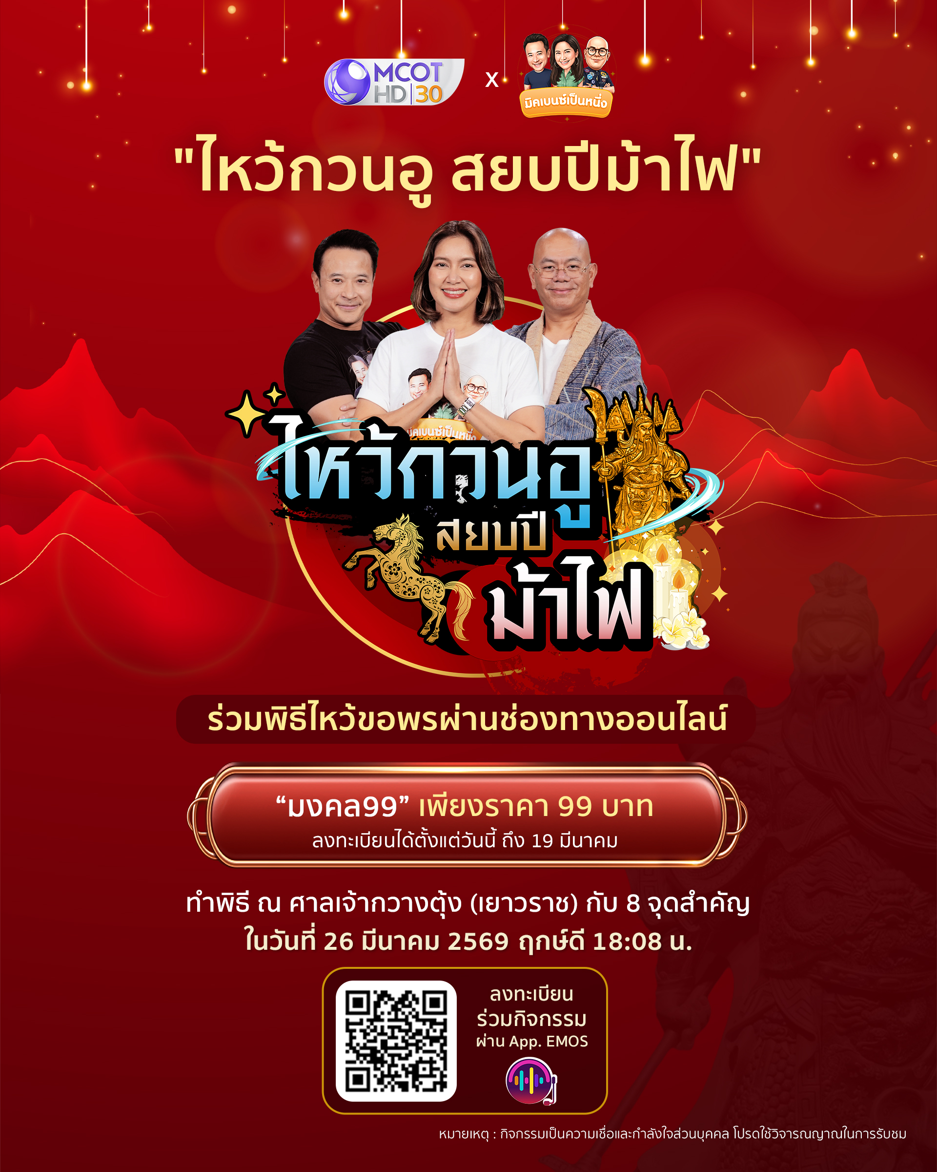 กิจกรรมดีดีเติมพลังใจเสริมพลังกาย “ไหว้กวนอู สยบปีม้าไฟ” ไหว้ขอพรแบบออนไลน์ “มงคล 99” เพียง 99 บาทเท่านั้น ลงทะเบียนได้เลยตั้งแต่วันนี้ – 19 มีนาคม โดยสามารถดูวิธีการลงทะเบียนได้ที่ https://mickbenzpernnueng.mcot.net/manual/manual.pdf?uuid=284d2821-c78c-4323-81e7-65d37a878cab