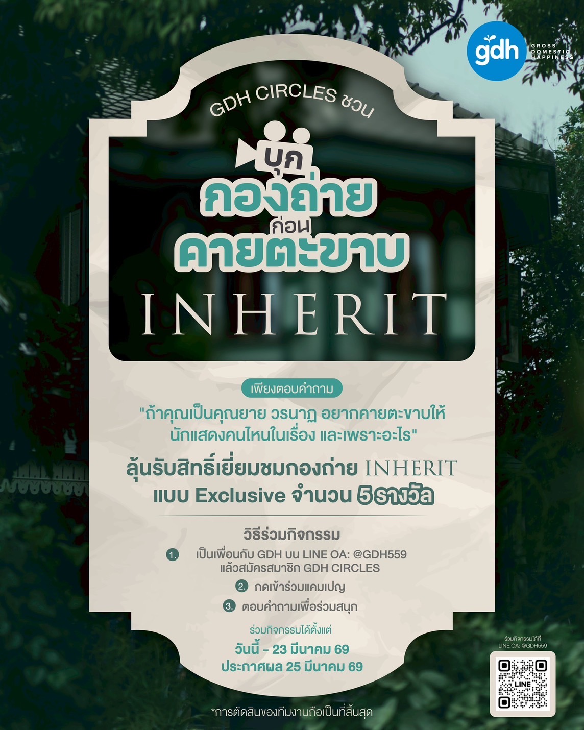 สำหรับกิจกรรมครั้งนี้ ผู้ร่วมสนุกจะต้องสมัครเป็นสมาชิก “GDH CIRCLES” ผ่าน LINE OA ของ “GDH” และเข้าร่วมแคมเปญ พร้อมตอบคำถามว่า “ถ้าคุณเป็นคุณยายวรนาฏ อยากคายตะขาบให้ นักแสดงคนไหนในเรื่อง และเพราะอะไร” โดยทีมงานจะคัดเลือกคำตอบที่โดนใจที่สุดจำนวน 5 คน เพื่อรับสิทธิ์เข้าร่วมเยี่ยมชมกองถ่ายภาพยนตร์เรื่อง “INHERIT” ในวันที่ 1 เมษายน 2569