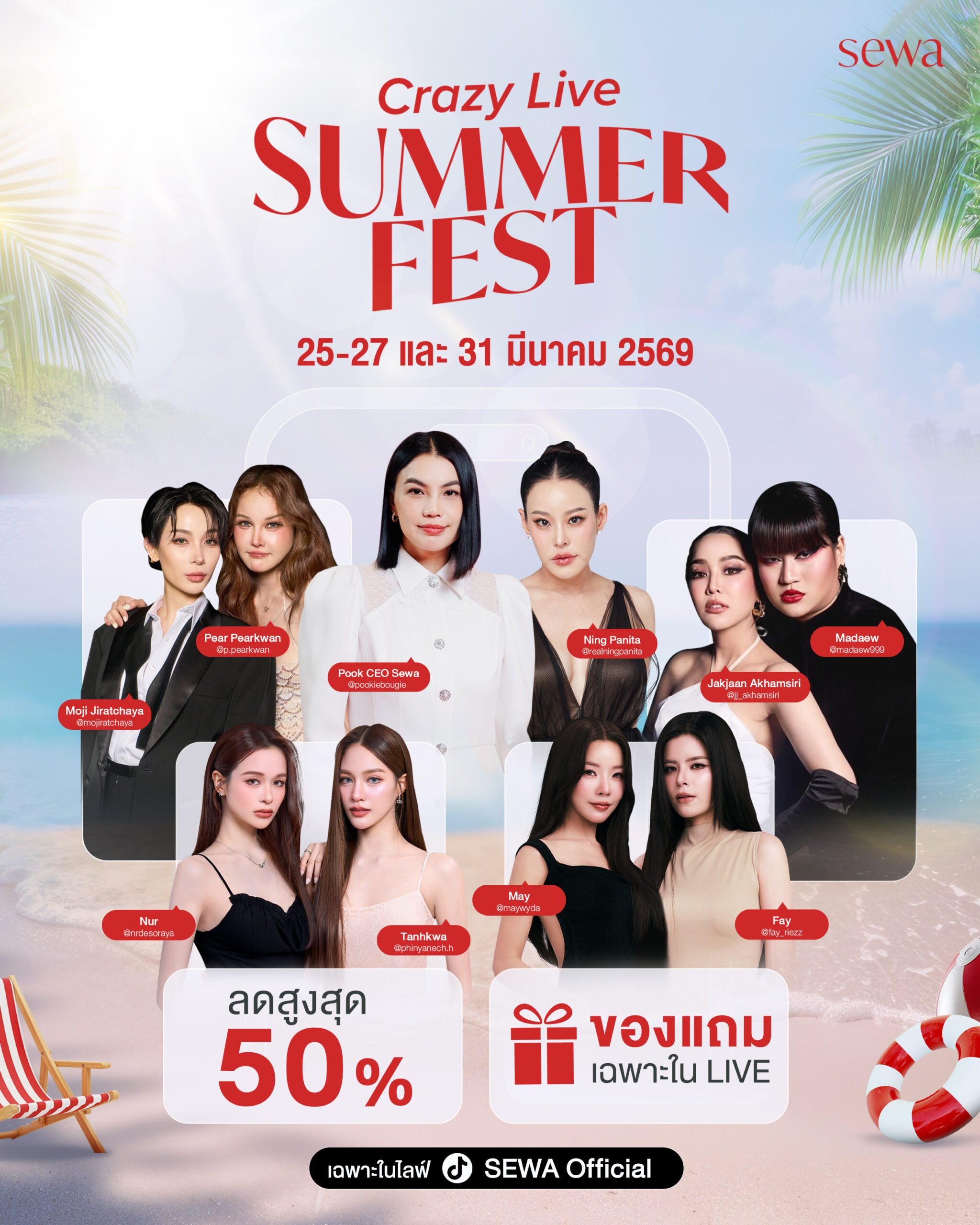 เริ่มปฏิการเปิดปาร์ตี้ Crazy Live Sewa Summer Fest ปักหมุดเริ่มคิวแรก 25 มีนาคม เวลา 18.00 พบกับซีอีโอตัวแม่กูรูงานผิว “คุณปุ๊ก-เบญจกิติ เมฆแสน” พร้อมด้วยตัวแม่ตัวมัม “หนิง ปณิตา” ที่จะมาตัดริบบิ้นปล่อยโปรเด็ด และ เวลา 20.00 น.เป็นต้นไป พบกับคู่จิ้นสะท้านเมือง “โม-แพรขวัญ” จาก “เดอะเทคฮอร์โมน” คิววันที่ 26 มีนาคม เวลา 18.00 เช็คลิสต์กันต่อที่ “ซีอีโอปุ๊ก ปะทะ “หนิงปณิตา” ฟาดต่อด้วยเวลา 20.00 น. พบกับ เจ้าแม่ไวรัลแห่งยุค “มะเดี่ยว” และ “น้องงอแง” ที่มาพร้อมกับพี่สาวคู่ใจ “จั๊กจั่น อคัมย์สิริ” วันที่ 27 มีนาคม เอาใจชาวเดอร์ และแฟนๆยูริ พบกับคู่จิ้นเคมีดีย์ต่อใจ “แตงกวา-เหนือ” มาพร้อมความฟินชุดใหญ่ไฟกะพริบ ตั้งแต่เวลา 19.00 น.เป็นต้นไป และ ปิดท้ายปลายเดือน 31 มีนาคม ดับอุณหภูมิความร้อนช่วงซัมเมอร์ด้วยคู่หวานสุดโบ๊ะบ๊ะ “เฟ-เมษ์” ที่พร้อมมาเซย์ฮัลโหลแฟนไทยและแฟนอินเตอร์ ดำเนินรายการด้วยตัวแม่สายชง “โซล SosatSeoulsay” ฟินจิกหมอนแน่นอน