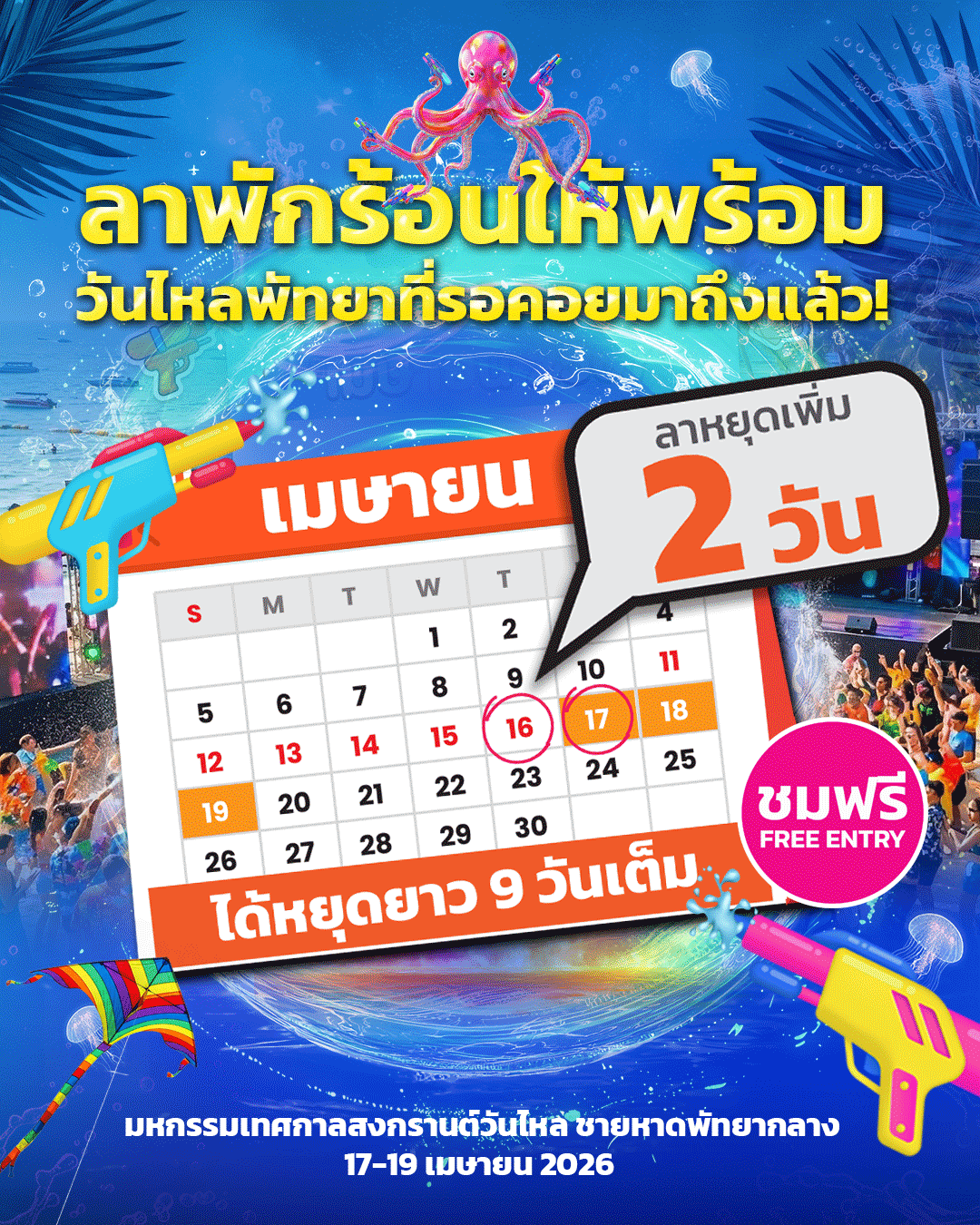 มาสนุกกันได้ในวันที่ 17–18-19 เมษายนนี้ เวลา 12.00–24.00 น. เข้าชมฟรีตลอดงาน พิเศษสุดวันที่ 19 เมษายน 2569 เตรียมพบกับประสบการณ์เชียร์บอลสุดเอ็กซ์คลูซีฟริมทะเล กับการถ่ายทอดสดศึก Premier League คู่เดือดระหว่าง Liverpool พบ Everton ถ่ายทอดสดจาก Hill Dickinson Stadium บนจอยักษ์ บอกเลยว่ามันส์ ใหญ่ สะใจ คอบอลห้ามพลาด!! ปักหมุดไว้….แล้วมาร่วมเป็นส่วนหนึ่งของปรากฏการณ์ “พัทยา สงกรานต์ วันไหล 2026” ที่เดือดสุดแห่งปี!!