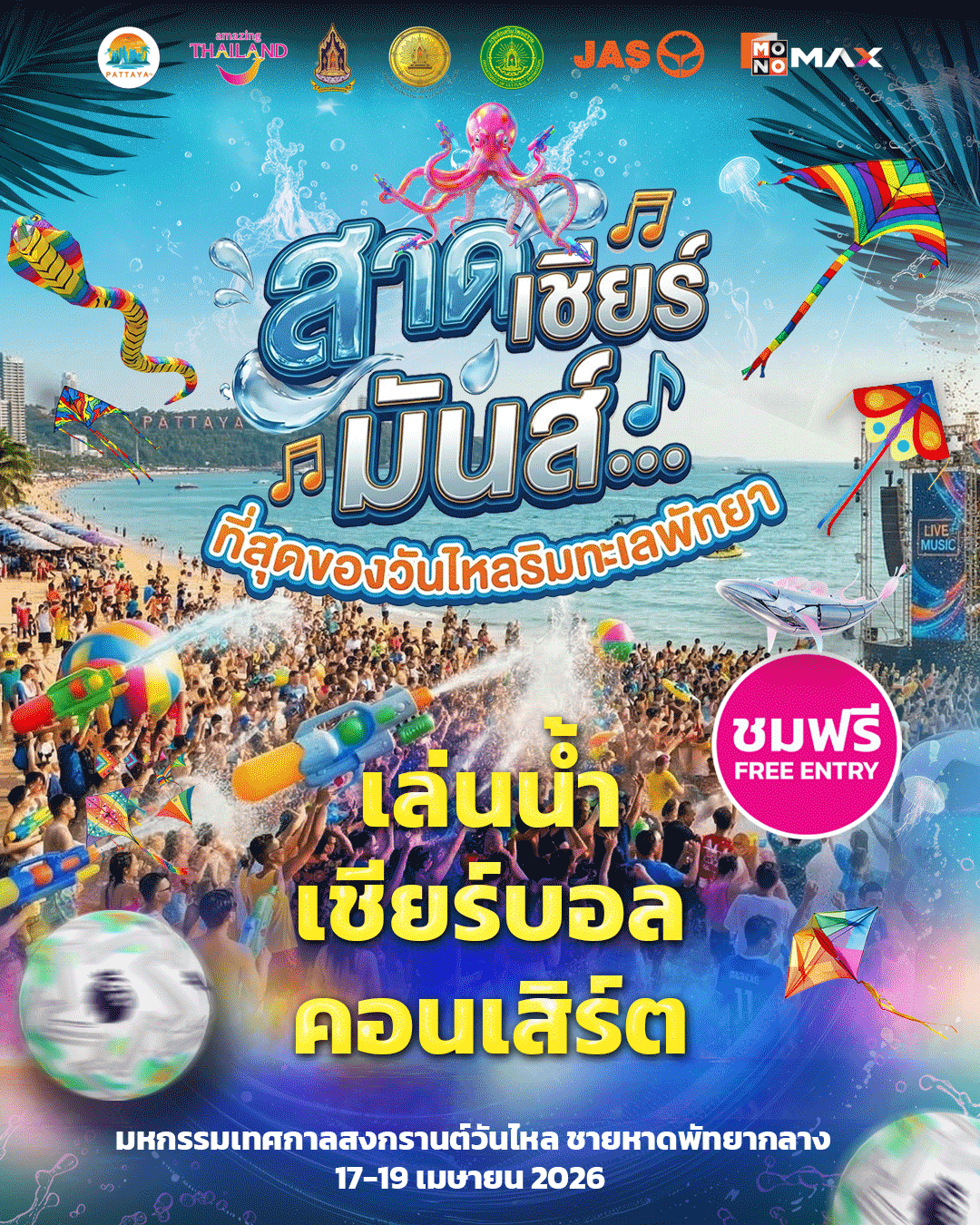 เตรียมตัวให้พร้อมกับมหกรรมความสนุกครั้งยิ่งใหญ่ที่ทุกคนรอคอย MONOMAX (โมโนแม็กซ์) เนรมิตชายหาดพัทยาให้กลายเป็นเวทีแห่งความสุข ในงาน “พัทยา สงกรานต์ วันไหล 2026” มหกรรมวันไหลริมทะเลสุดยิ่งใหญ่แห่งเดียวในประเทศไทย ที่พร้อมต้อนรับนักท่องเที่ยวทั้งชาวไทยและต่างชาติ ให้มาร่วม “สาด เชียร์ มันส์” เฉลิมฉลองเทศกาลสงกรานต์อย่างยิ่งใหญ่ตลอด 3 วัน แบบจัดหนักจัดเต็มครบทุกความสนุก!! “พัทยา สงกรานต์ วันไหล 2026” จึงไม่ใช่แค่งานเล่นน้ำสงกรานต์ที่ธรรมดา แต่คือมหกรรมความสุขริมทะเลที่รวมทุกความสนุก ความมันส์ และเสน่ห์ของวัฒนธรรมไทยไว้ในที่เดียว พร้อมตอกย้ำภาพลักษณ์ของเมืองพัทยาในฐานะจุดหมายปลายทางแห่งเทศกาลระดับโลก ที่จะทำให้สงกรานต์ปีนี้ยิ่งใหญ่ สนุก และน่าจดจำที่สุด!! พบกับคอนเสิร์ตจากศิลปินดังตลอด 3 วันเต็ม และ T-POP สุดฮอตที่พร้อมระเบิดความมันส์แบบนันสต๊อป กับโปรดักชั่น แสง สี เสียง สุดอลังการ บนพื้นที่ชายหาดพัทยาเหนือจรดใต้