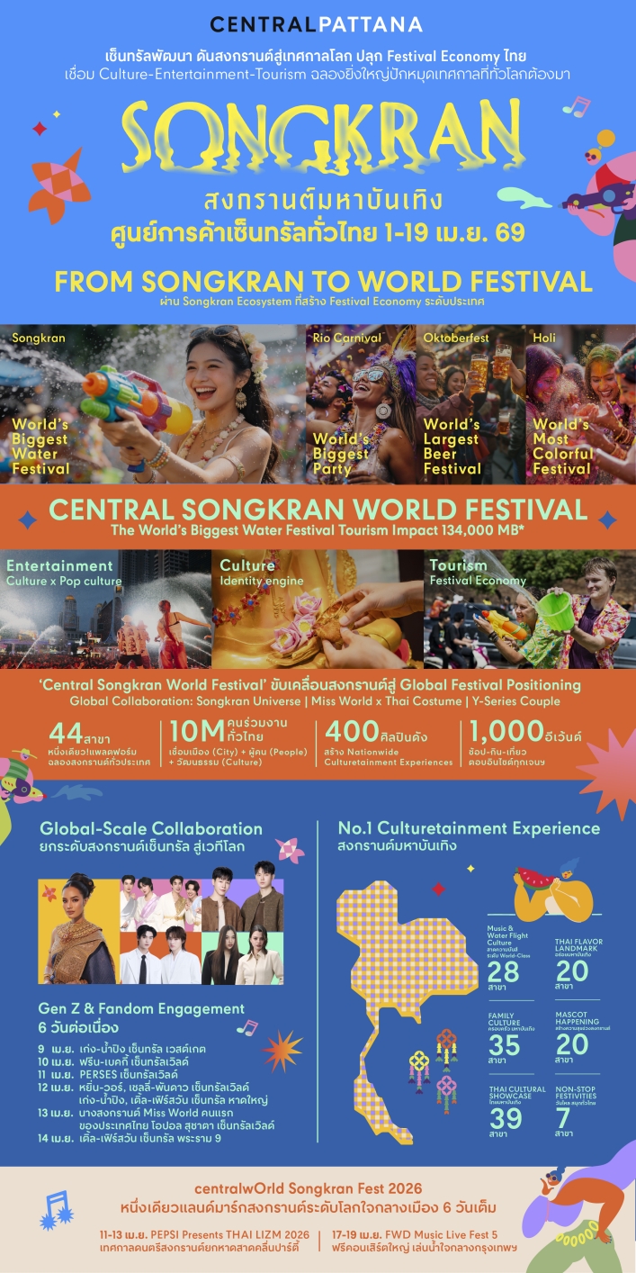 กรุงเทพฯ – บริษัท เซ็นทรัลพัฒนา จำกัด (มหาชน) ผู้นำอสังหาริมทรัพย์ไทยและผู้บริหารศูนย์การค้าเซ็นทรัลทั่วประเทศ เตรียมฉลองเทศกาลสงกรานต์ยิ่งใหญ่ทั่วประเทศ เปิด Thailand’s Songkran Festival 2026 สงกรานต์มหาบันเทิง มอบประสบการณ์ Culturetainment ระดับโลก ที่ผสาน Entertainment-Culture-Tourism เริ่มตั้งแต่วันที่ 1 – 19 เม.ย.2569 ใกล้ที่ไหน ไปที่นั่น เที่ยวได้ทุกที่ ใกล้สุด สนุกสุด ครบสุด ที่ศูนย์การค้าเซ็นทรัลทั่วประเทศ