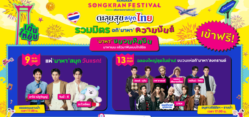 ชวนทุกคนมาสัมผัสความสนุกผสานอัตลักษณ์ไทยกับเทศกาลดนตรีรูปแบบ POP-CULTURE FESTIVAL โดยพิธีเปิดจัดขึ้นวันที่ 9 เม.ย. 2569 เวลา 17.00 น. พบกับ ขบวนแห่ “มาหา” สนุก สุดยิ่งใหญ่ในซอยรางน้ำ นำโดย อาโป-ณัฐวิญญ์, จิมมี่-จิตรพล,ซี-ทวินันท์ และกิจกรรม มิตร & GREET กับ อาโป-ณัฐวิญญ์, จิมมี่-จิตรพล, ซี-ทวินันท์ และน้องอะโวเชี่ยน ( AVOCEAN) พลาดไม่ได้! วันมหาสงกรานต์ 13 เม.ย. 2569 เวลา 17.00 น. กับขบวนแห่อภิ “มาหา” สงกรานต์ สุดยิ่งใหญ่ จากอนุสาวรีย์ชัยสมรภูมิ นำโดย เจฟ ซาเตอร์, เจมีไนน์-นรวิชญ์, โฟร์ท-ณัฐวรรธน์, ปอนด์-ณราวิชญ์, ภูวินทร์, แอนนา เสือ และ LYKN