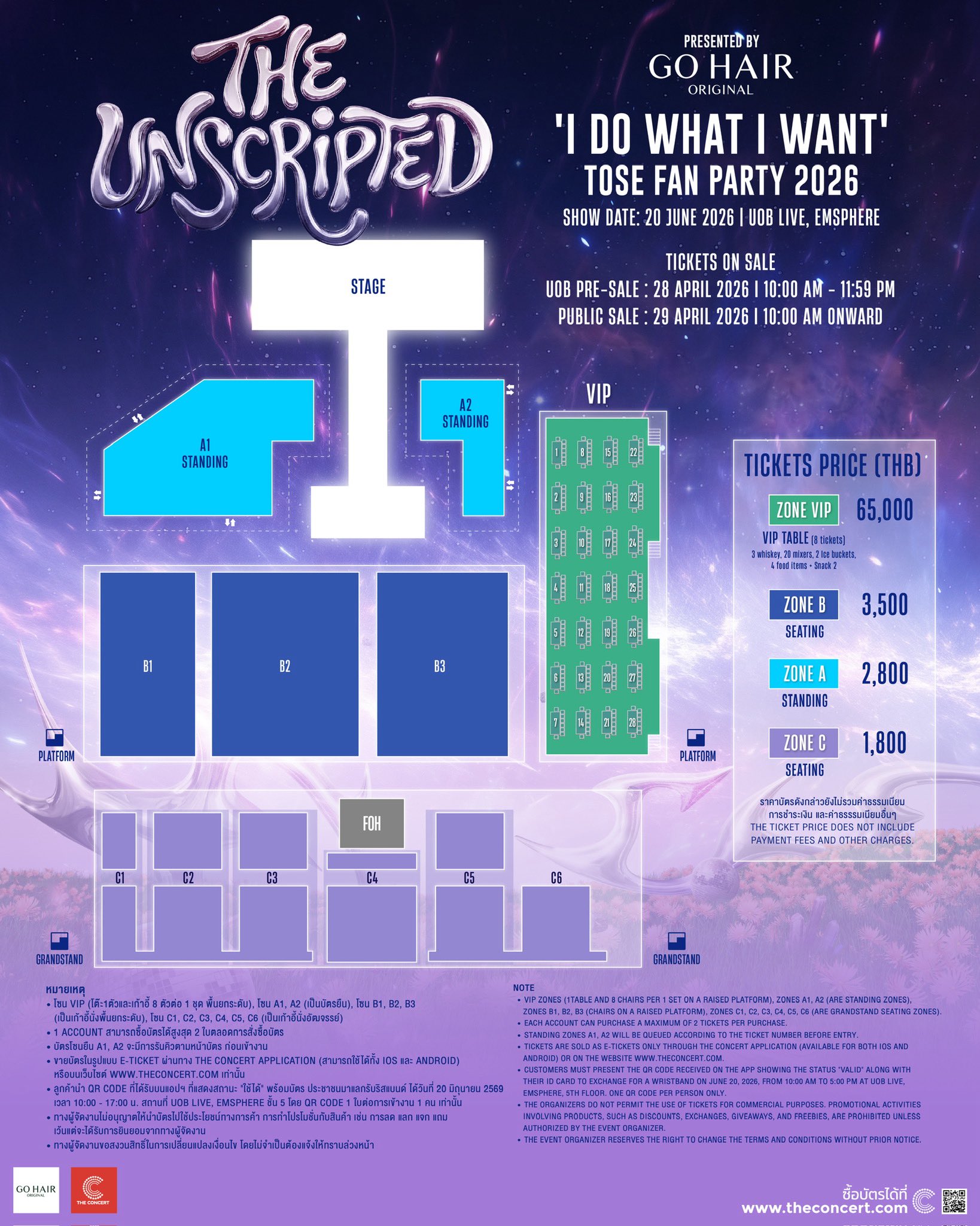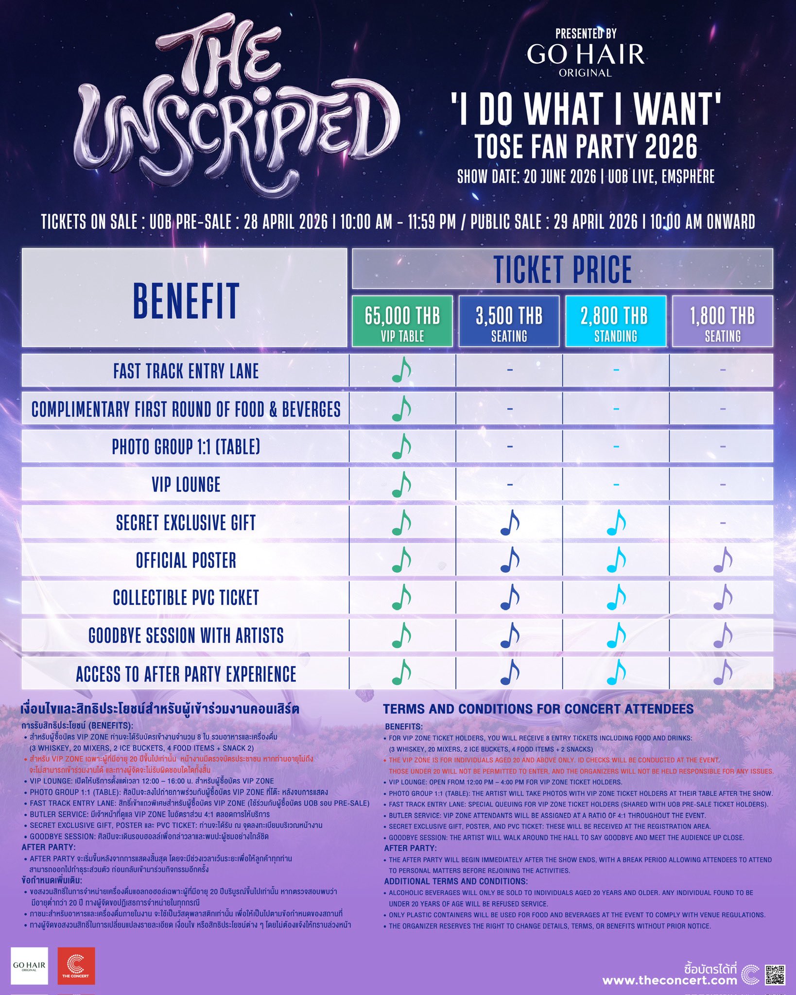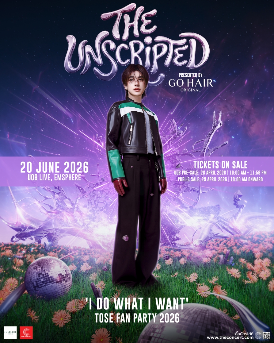 เตรียมตัวให้พร้อมและมาสัมผัสประสบการณ์ความสุขครั้งสำคัญที่เป็นมากกว่าคอนเสิร์ต ร่วมร้องเพลงฮิตในวันวานไปด้วยกัน ใน ‘TOSE FAN PARTY : THE UNSCRIPTED Presented by GO HAIR’ เปิดจำหน่ายบัตรรอบ UOB Pre-sale ในวันที่ 28 เมษายน 2569 เวลา 10.00 – 11.59 น. และรอบ Public Sale วันที่ 29 เมษายน 2569 เวลา 10.00 น. บัตรนั่งราคา 1,800 และ 3,500 บาท / บัตรยืนราคา 2,800 บาท และ Zone VIP 65,000 บาท จองบัตรให้พร้อมและมาสนุกไปด้วยกันวันที่ 20 มิถุนายน 2569 ณ UOB Live, Emsphere
