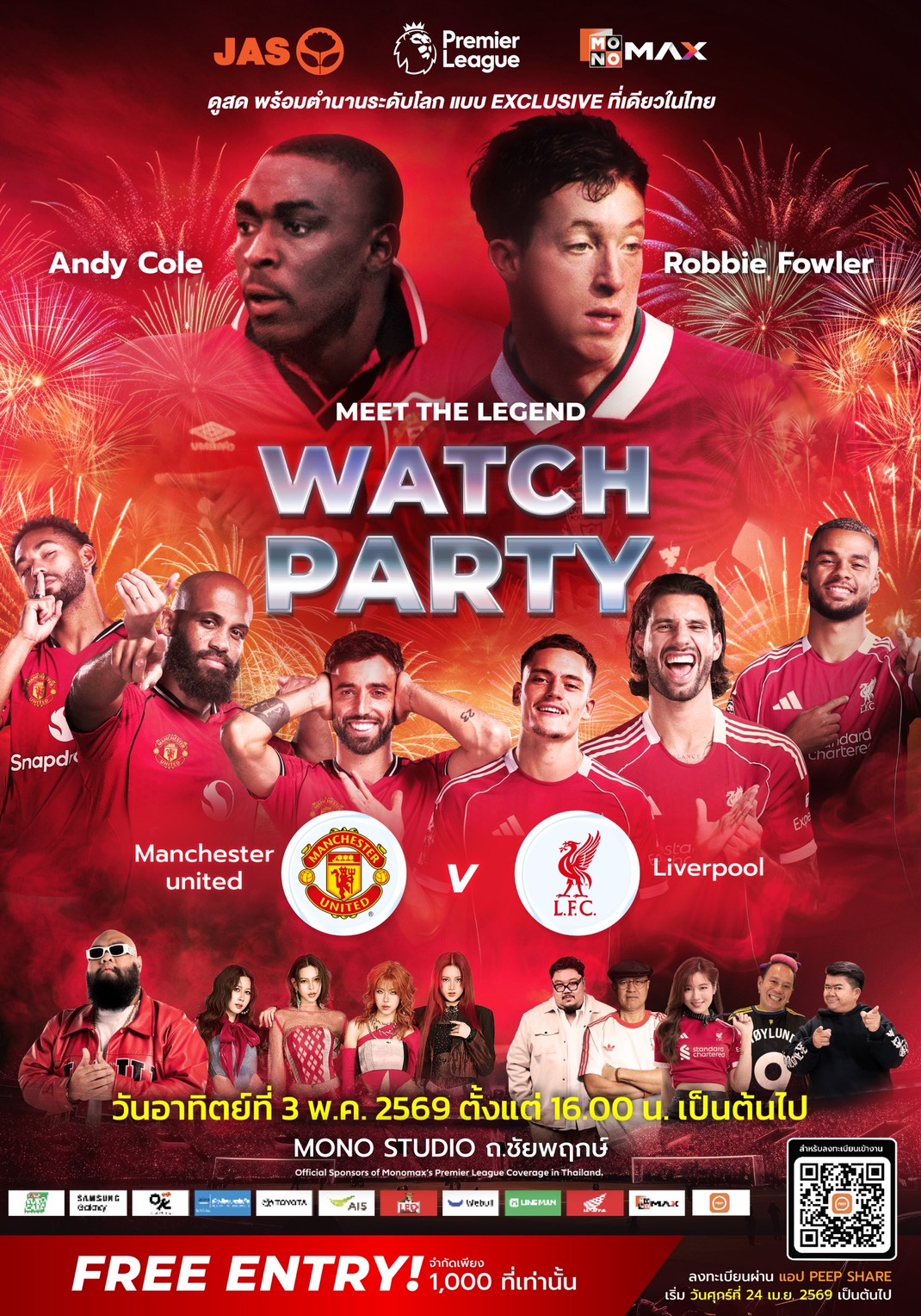 บริษัท จัสมิน อินเตอร์เนชั่นแนล จำกัด (มหาชน) หรือ JAS ผู้ถือลิขสิทธิ์ฟุตบอลพรีเมียร์ลีกอังกฤษ และเอมิเรตส์เอฟเอคัพอย่างเป็นทางการ ร่วมกับ Monomax แพลตฟอร์มหลักในการถ่ายทอดสดฟุตบอลพรีเมียร์ลีกและเอมิเรตส์เอฟเอคัพตลอด 6 ฤดูกาล เตรียมระเบิดความมันส์ครั้งใหญ่เอาใจคอบอลชาวไทย จัดงาน “MONOMAX WATCH PARTY: RED MATCH” ปาร์ตี้ชมฟุตบอลสุดยิ่งใหญ่ ควบคอนเสิร์ตและความบันเทิงแบบจัดเต็ม ในศึก “แดงเดือด” ระหว่าง แมนเชสเตอร์ ยูไนเต็ด พบ ลิเวอร์พูล ที่แฟนบอลทั่วโลกรอคอย